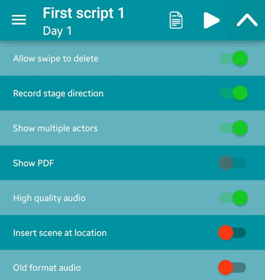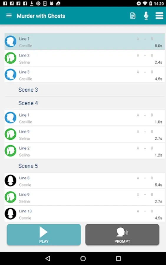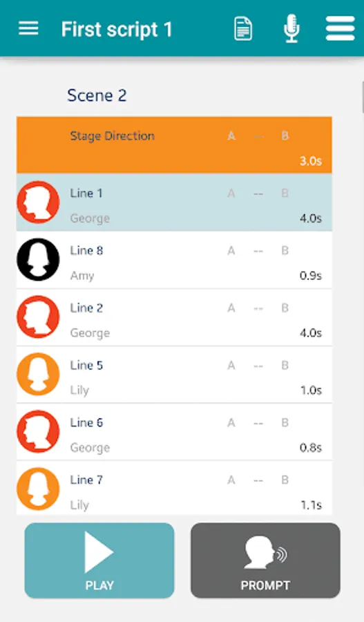 By recording yours and others lines on your tablet or smartphone, you can choose to play back the scenes with or without your lines being audible – leaving you to practice your lines in the gaps or hear your lines again, aiding memorisation. If you forget, press the prompt button!