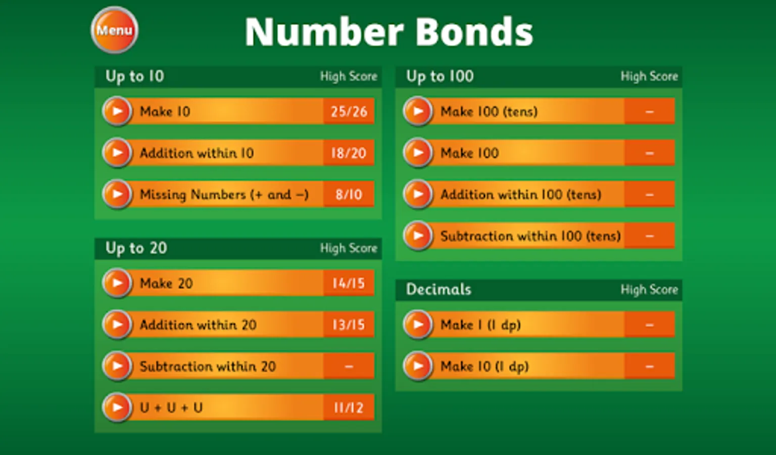 After each game, the score achieved is displayed along with the child's high score. Bronze, silver or gold stars and trophies are awarded depending on the score achieved in each game.