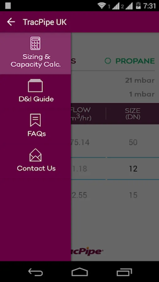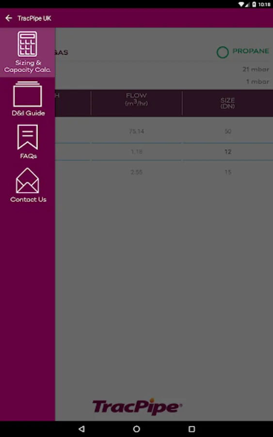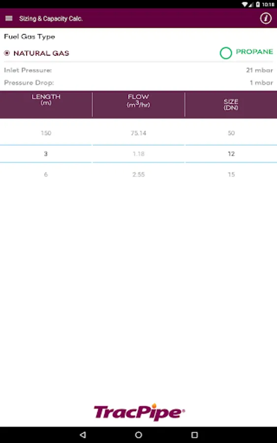 This App allows the user to size the TracPipe® Flexible Gas Piping product, using an appropriate sizing method. The App displays the appropriate size of TracPipe® for a given capacity depending on the type of gas, supply pressure and allowable pressure drop selected by the user. By selecting the design parameters using easy drop down menus the user then chooses the length of pipe and tubing size, on the easy to read calculator wheel, to find the capacity capable of being delivered by any of the seven sizes offered by TracPipe®.