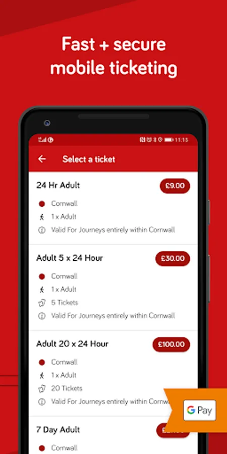 Mobile Tickets Purchase mobile tickets securely with a debit/credit card or with Google Pay and show the driver when boarding - no more searching for cash!