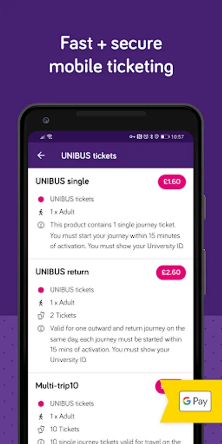 Mobile Tickets Purchase mobile tickets securely with a debit/credit card or with Google Pay and show the driver when boarding - no more searching for cash!