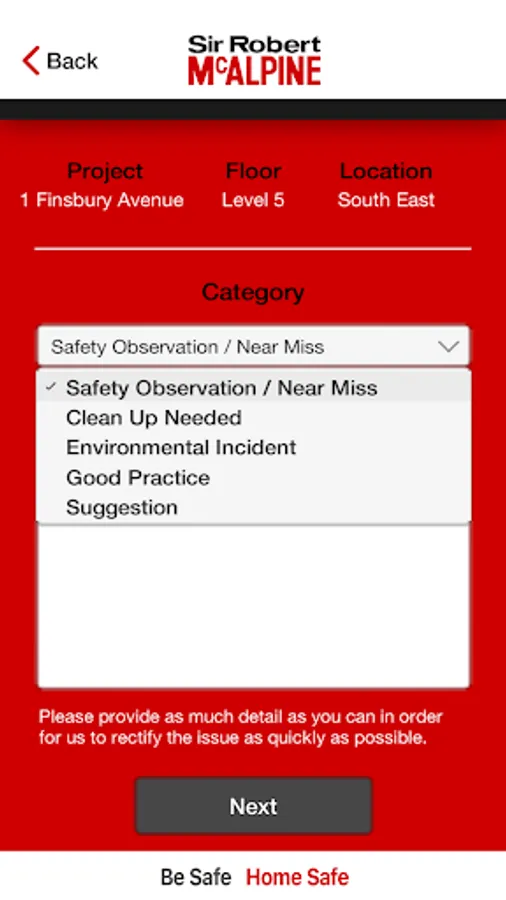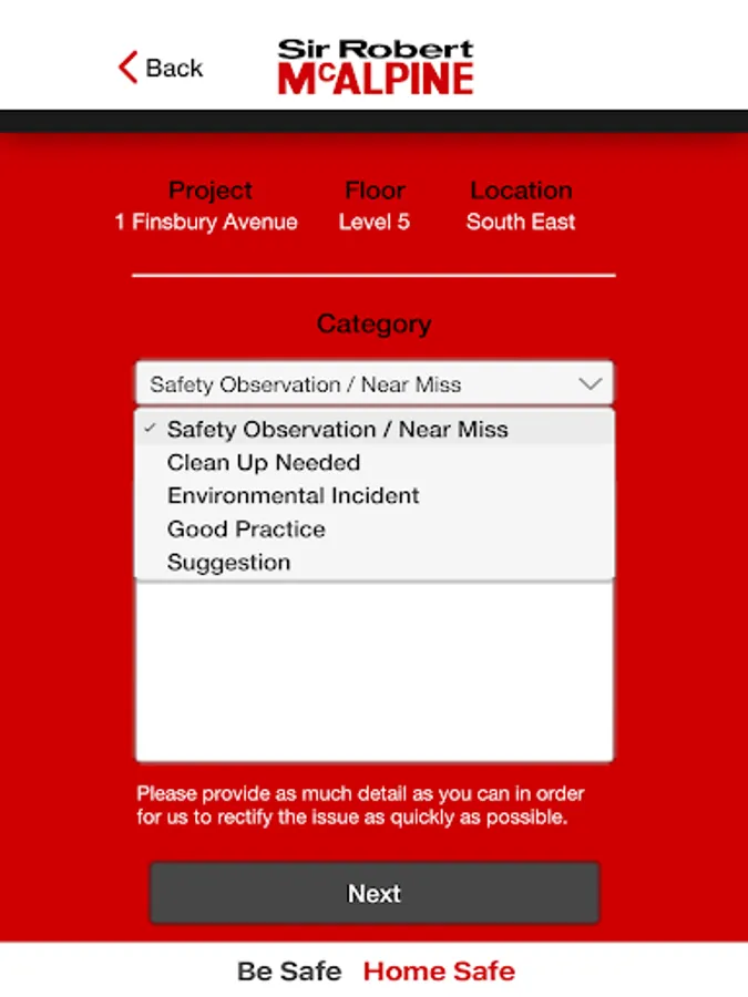 The Have Your Say App looks to attain high standards of both procedural and behavioural H&S practice on Sir Robert McAlpine sites at Broadgate by providing an additional channel for operatives to report any safety observations, near misses and other issues. It also provides a mechanism for making recommendations, suggestions and putting forward ideas for good practice.