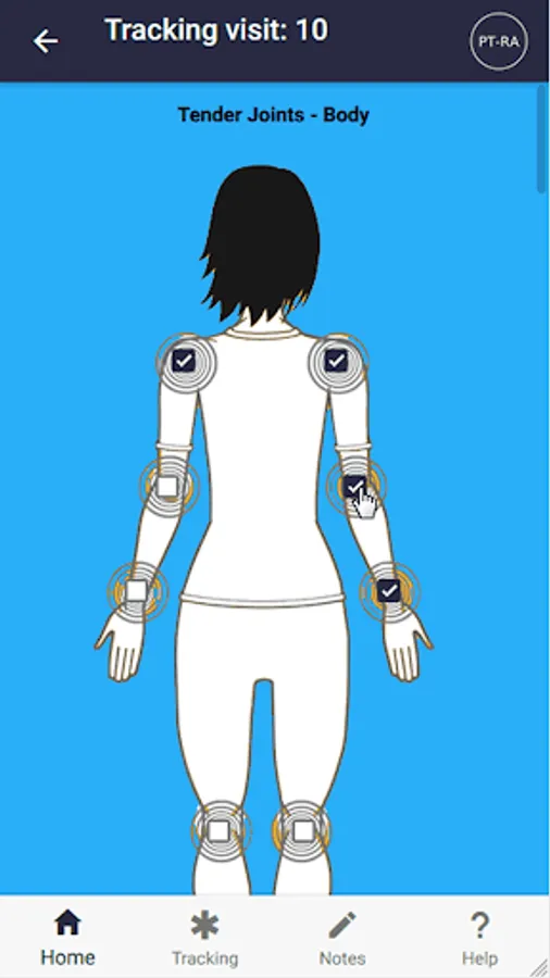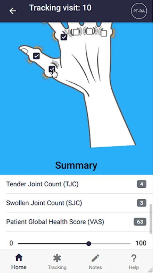 Phospho-Tof-RA Study App enables remote submission of patient joint counts and Visual Analog Score (VAS) to an external RA database so progress of inflamed or swollen joints could be easily followed for the duration of the study. This is an essential component for tracking Rheumatoid Arthritis disease activity.