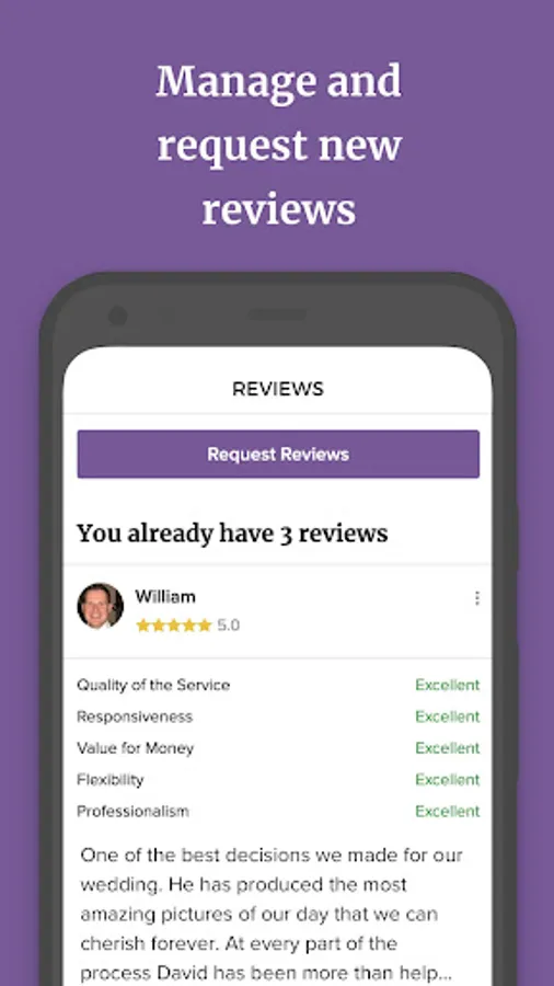 With the app for professionals, you can manage the information and photos of your profile, and get in touch with wedding couples from your phone: