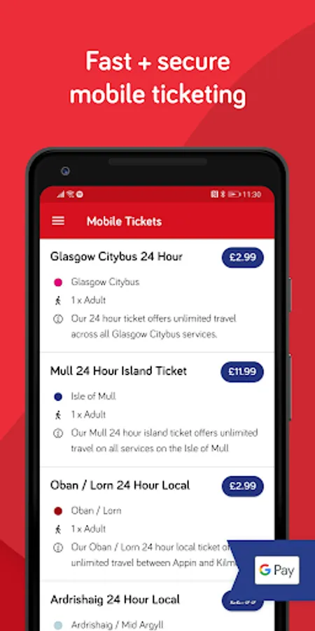 Mobile Tickets Purchase mobile tickets securely with a debit/credit card or with Google Pay and show the driver when boarding - no more searching for cash!