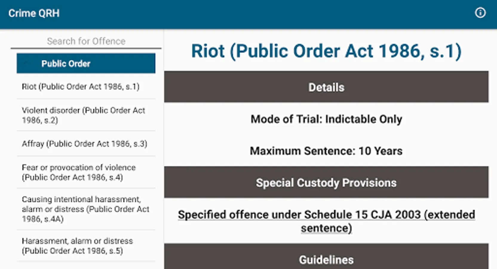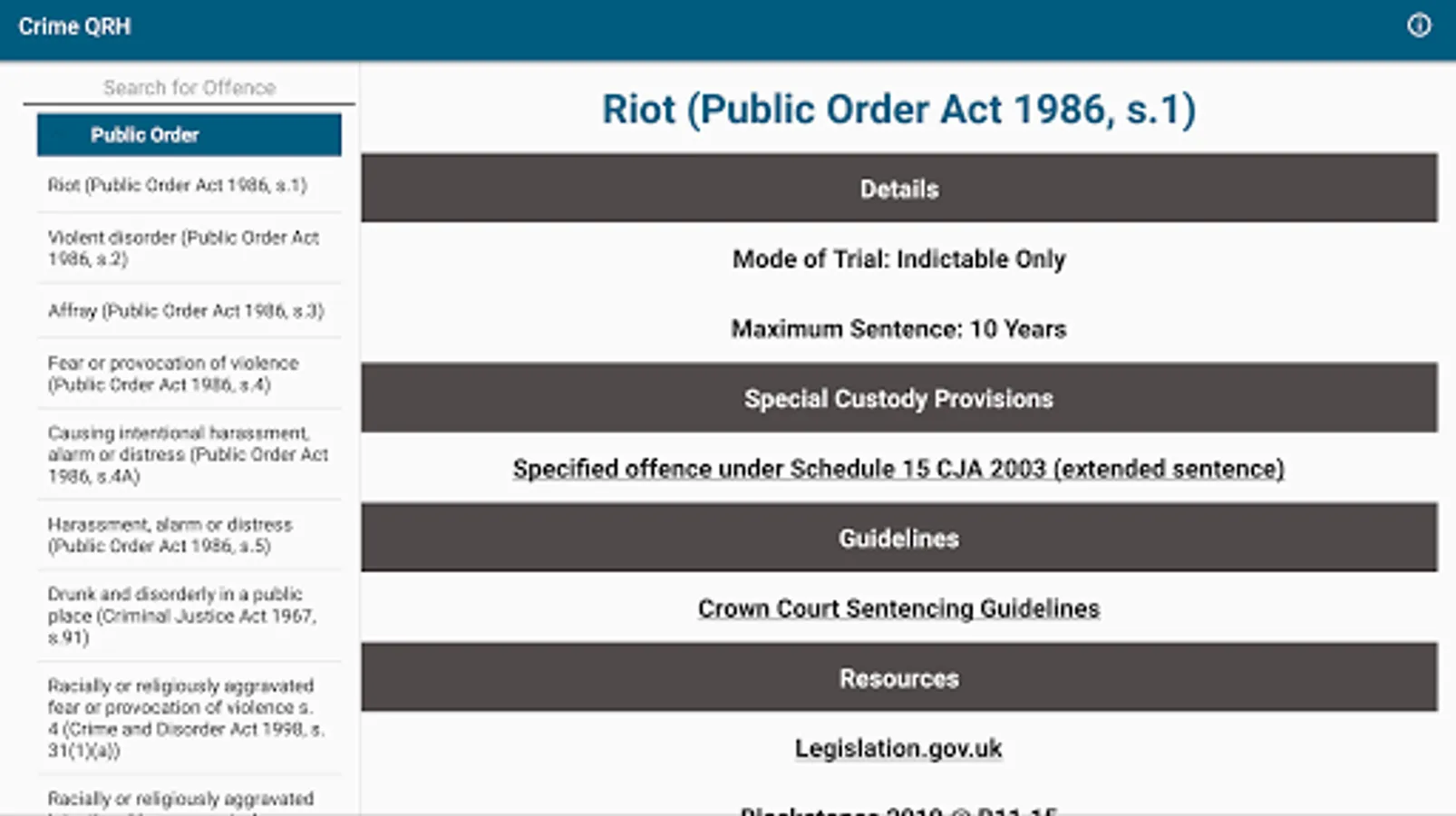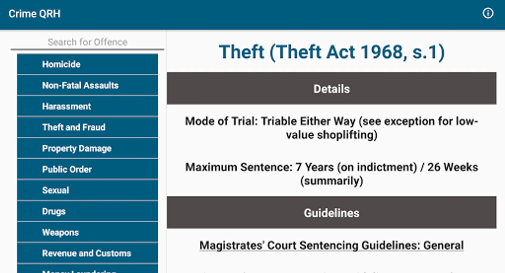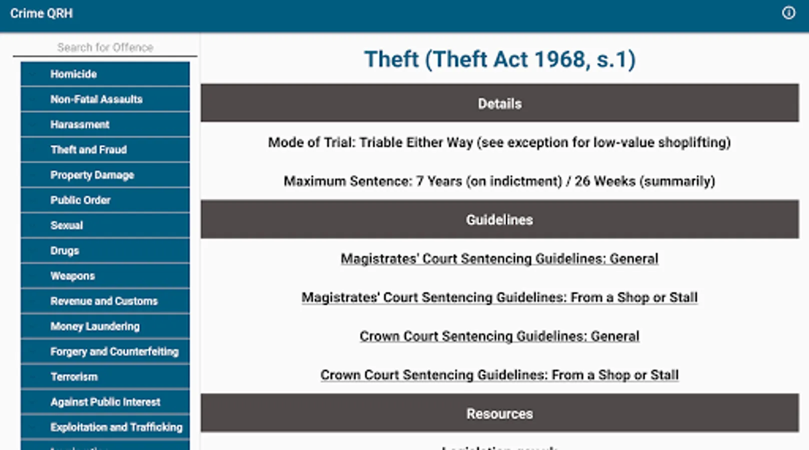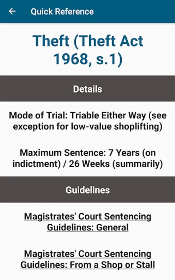 Where applicable, access the live Magistrates' Court and Crown Court Sentencing Guidelines for an offence with a single tap.