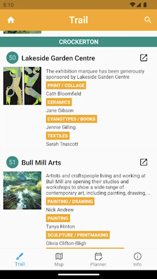 - This app lists all the venues and artists on the trail, detailing the art and craft on display, and includes information about hands-on courses and teaching on offer.