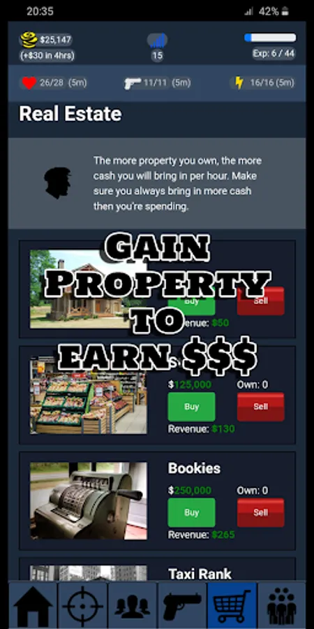 You’ll never survive in this world without having some cash coming in. Buy property to gain a regular income which you will need to maintain your equipment. The more property you own, the more cash will flow but be careful as you’ll need more equipment to defend your cash and equipment doesn’t come cheap. Ever wanted to own a casino or even an airline? Now’s your chance, if you can survive long enough to take out those around you.