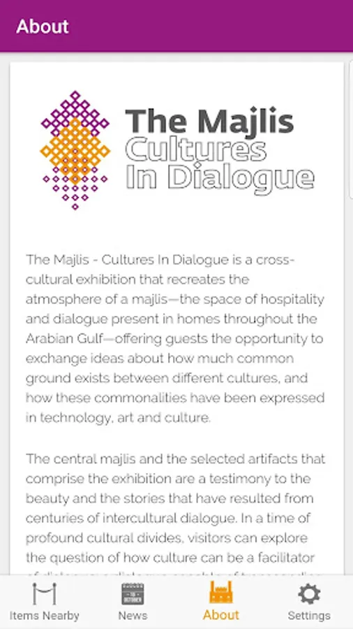 The Majlis - Cultures In Dialogue official app is location based smartphone app which is used beacons to identify the artefacts nearby and displays more information about the object of choice. The app helps visitors to understand better the cross-cultural exhibition that recreates the atmosphere of a majlis—the space of hospitality and dialogue present in homes throughout the Arabian Gulf—offering guests the opportunity to exchange ideas about how much common ground exists between different cultures, and how these commonalities have been expressed in technology, art and culture.