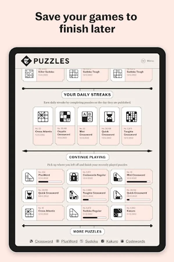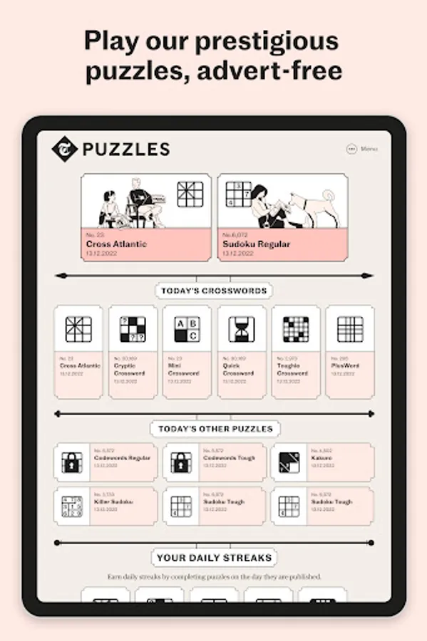 Inside the Puzzles app, you'll find daily games that fit every schedule and level of ability. Get your mind whirring every morning with the Mini Crossword - a puzzle you can solve in a matter of minutes (or less). Pit your wits against our characterful Cross Atlantic, a US-style crossword with bags of British intelligence. Or put your number skills to the ultimate test, in the form of our fearsome Killer Sudoku.