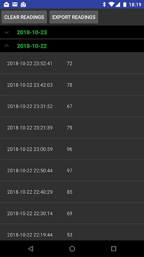 The readings are also stored in a local database and can be exported to a CSV file for sharing. The frequency of the recordings can be changed in the app settings.