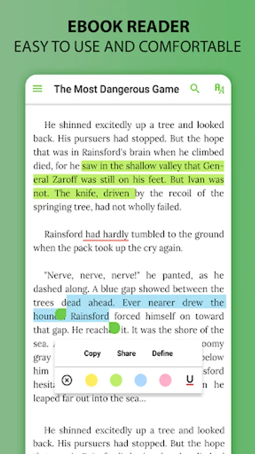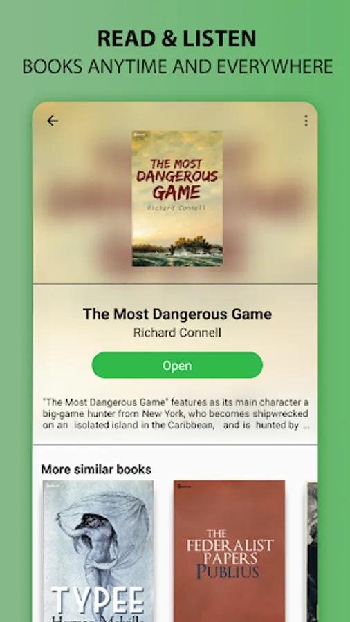 Use amazing ebook reader to read free books. It's eye friendly and easy to use. With it you can read very quickly. You can change the font size and set night mode. Highlight you favorite parts of the book to come back to them in the future.