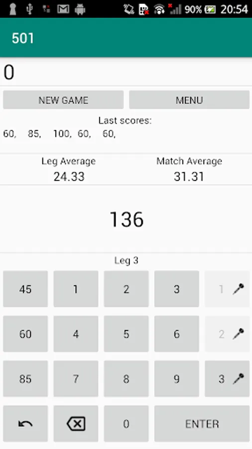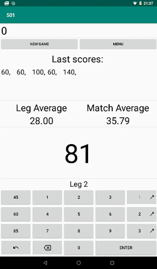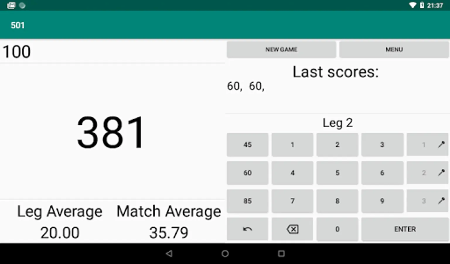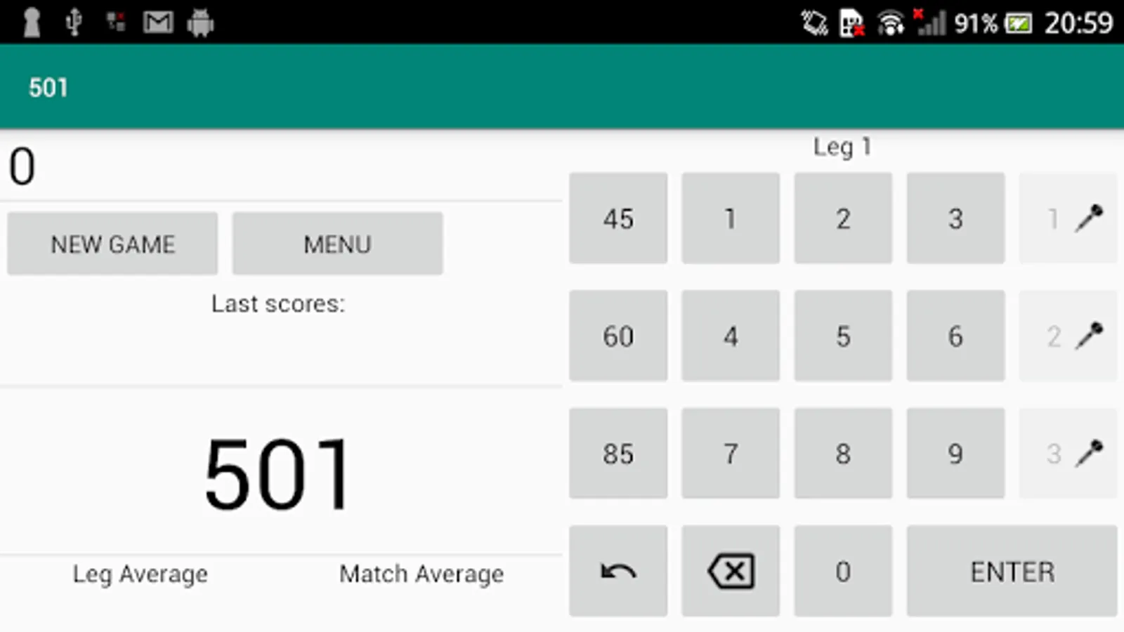 As you practice games of 501 darts you can record your scores. The app will calculate and then display the score you have remaining, your leg average and match average. The app will also display the scores you have hit in the current leg along with displaying what leg you are currently playing. Play as many legs as you wish. When you get down to a possible check out and take it out simply press the number of darts taken to finish the leg.