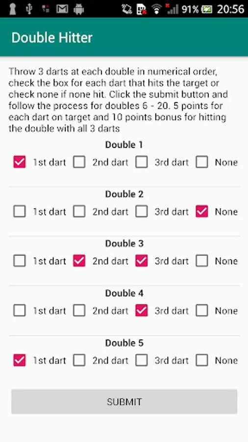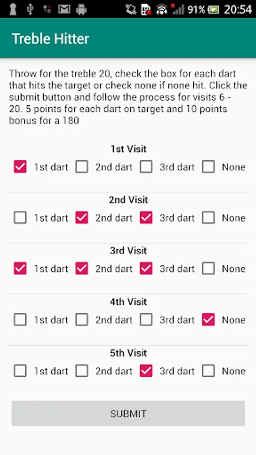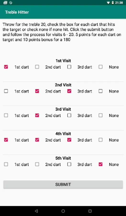 Record each dart that hits the target by checking the relevant checkbox. After every 5 visits click the submit button at the bottom of the screen to move forward to the next 5 visits. This will also update your current score and detail how successful you have been with your 1st, 2nd and 3rd darts. Score 5 points for each successful hit of the target and a 10 point bonus if all 3 darts hit the target, 500 points available. At completion of the 20 visits you will be presented with your final score and individual dart success.