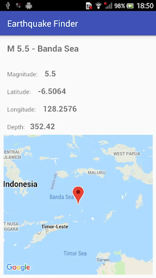 Clicking on the earthquake opens up further information which includes latitude, longitude and depth. A map is shown pinpointing where the earthquake occurred.