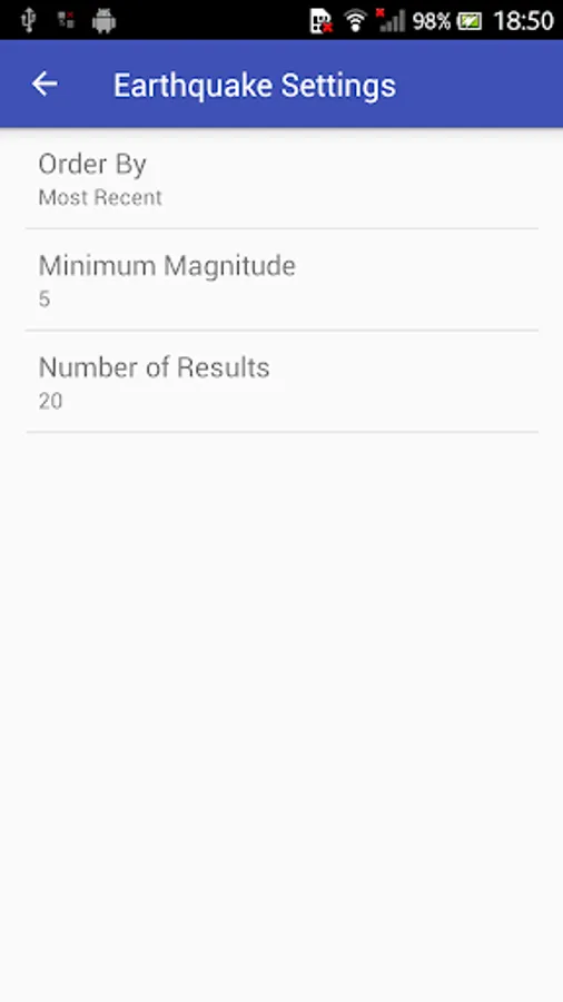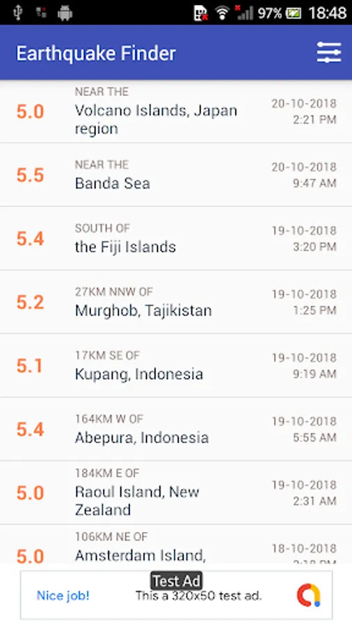 Results are provided in a tidy list view. The information provided is the magnitude, location, date and time.
