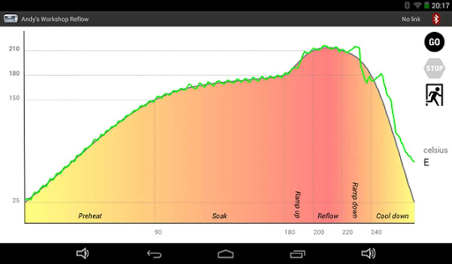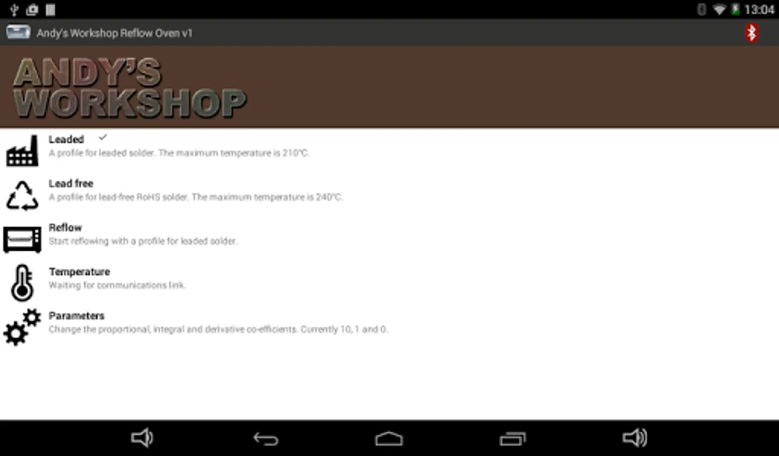 Andy's Workshop Reflow Oven app is used to control the reflow oven documented here: http://andybrown.me.uk/2015/07/12/awreflow2. This is an open source and open hardware project that allows home engineers and hardware hackers to build their own reflow oven and control it using an android app over bluetooth.