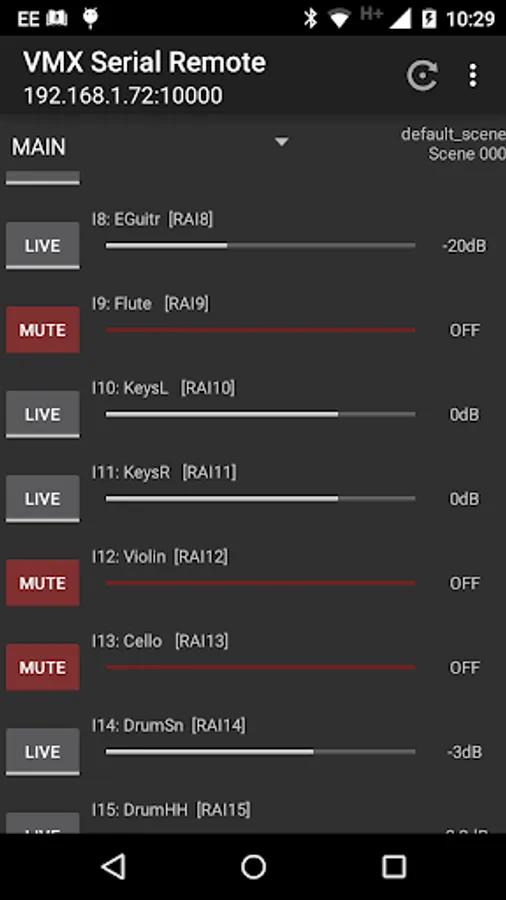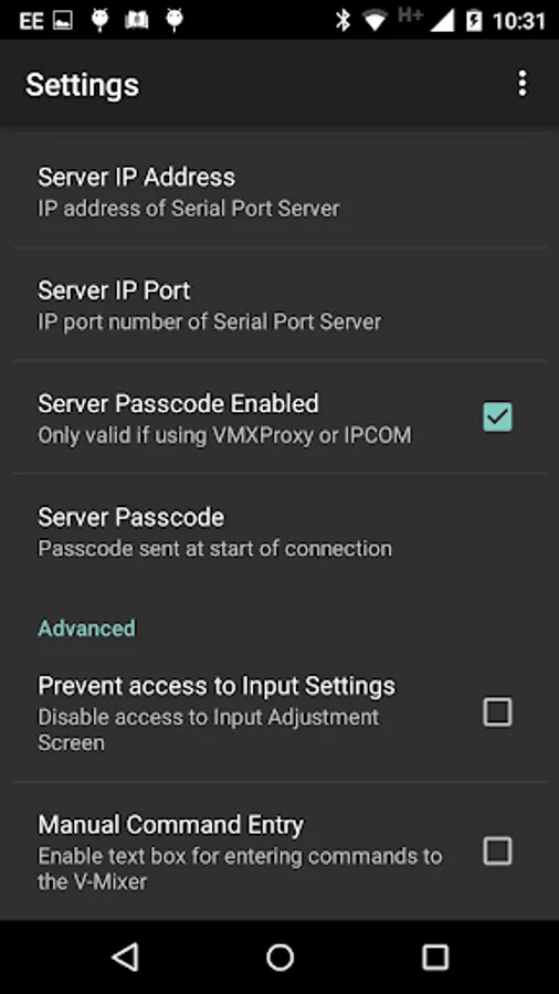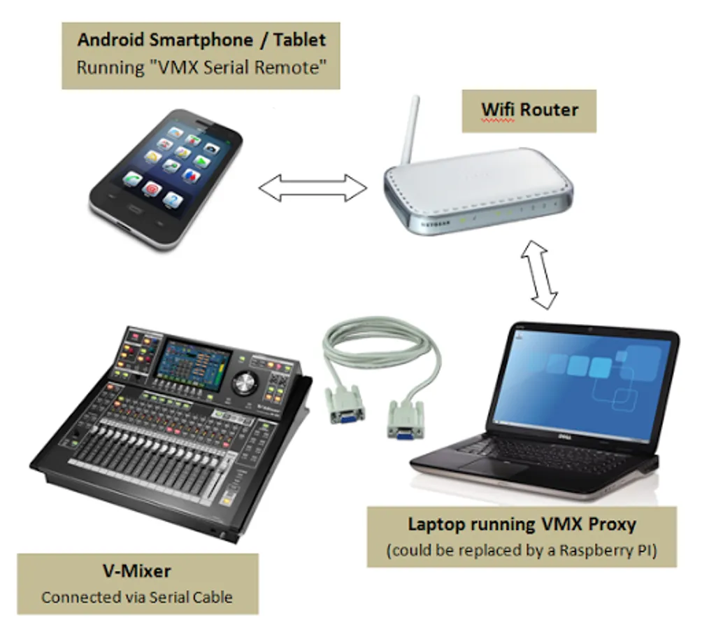 This app connects to the Mixer's RS232 port through an inexpensive RS232 Bluetooth Adaptor or a PC/RaspberryPI running a free small background program (VMXProxy - see http://goo.gl/iUfjW).