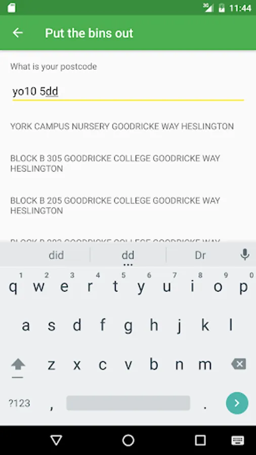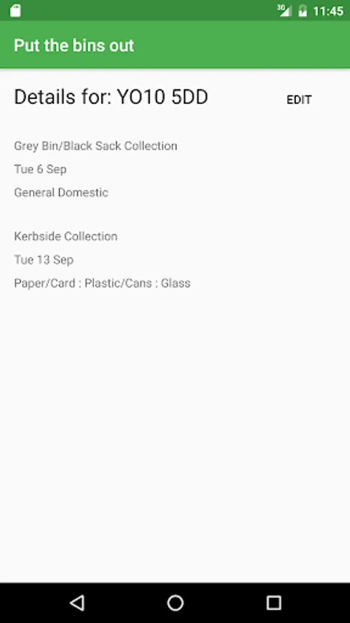 Uses your postcode to find out when it's time to put the bins out, and what type of bins should be put out.