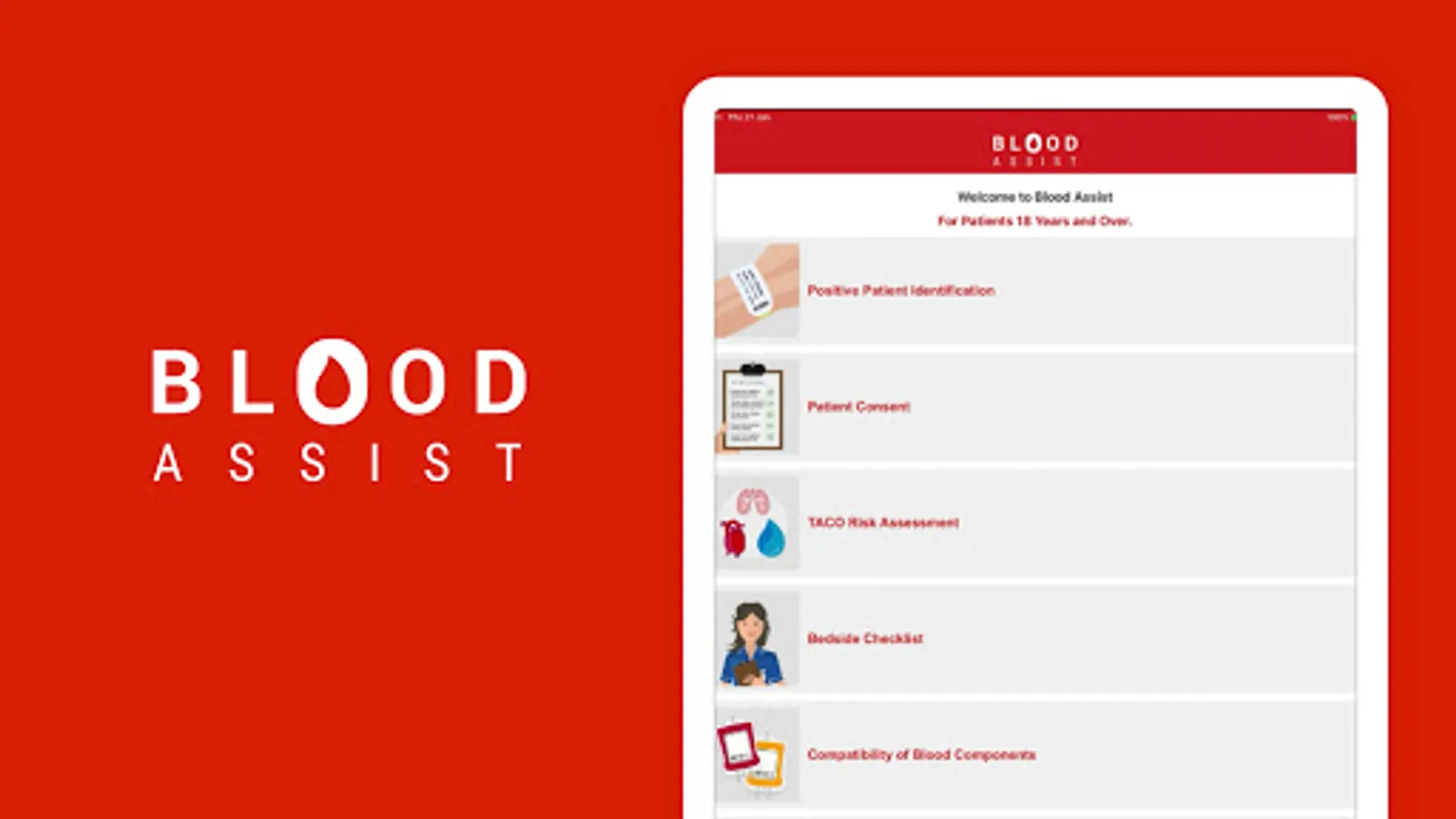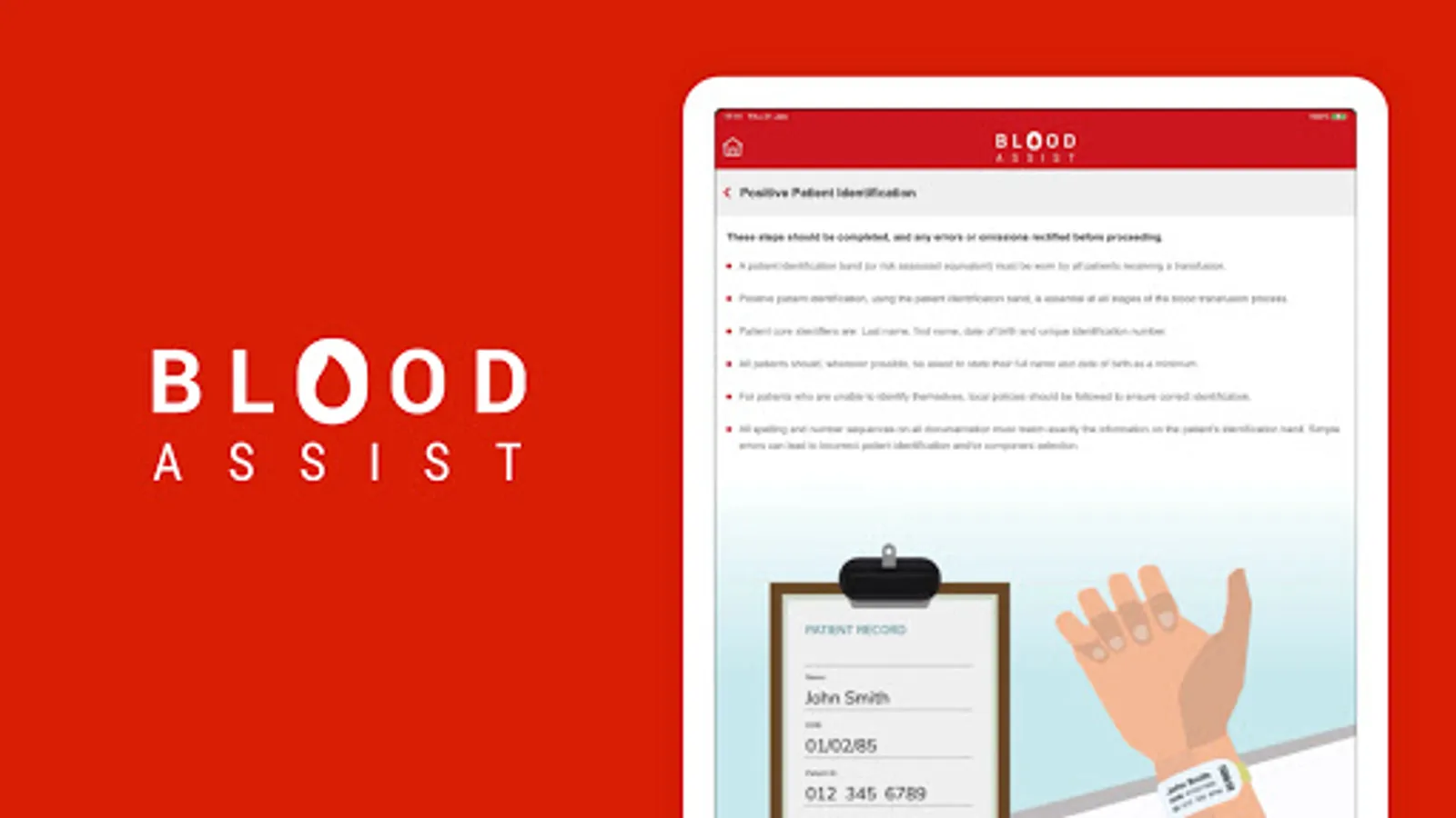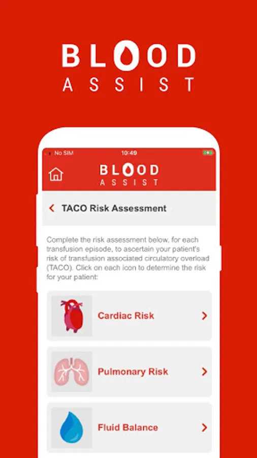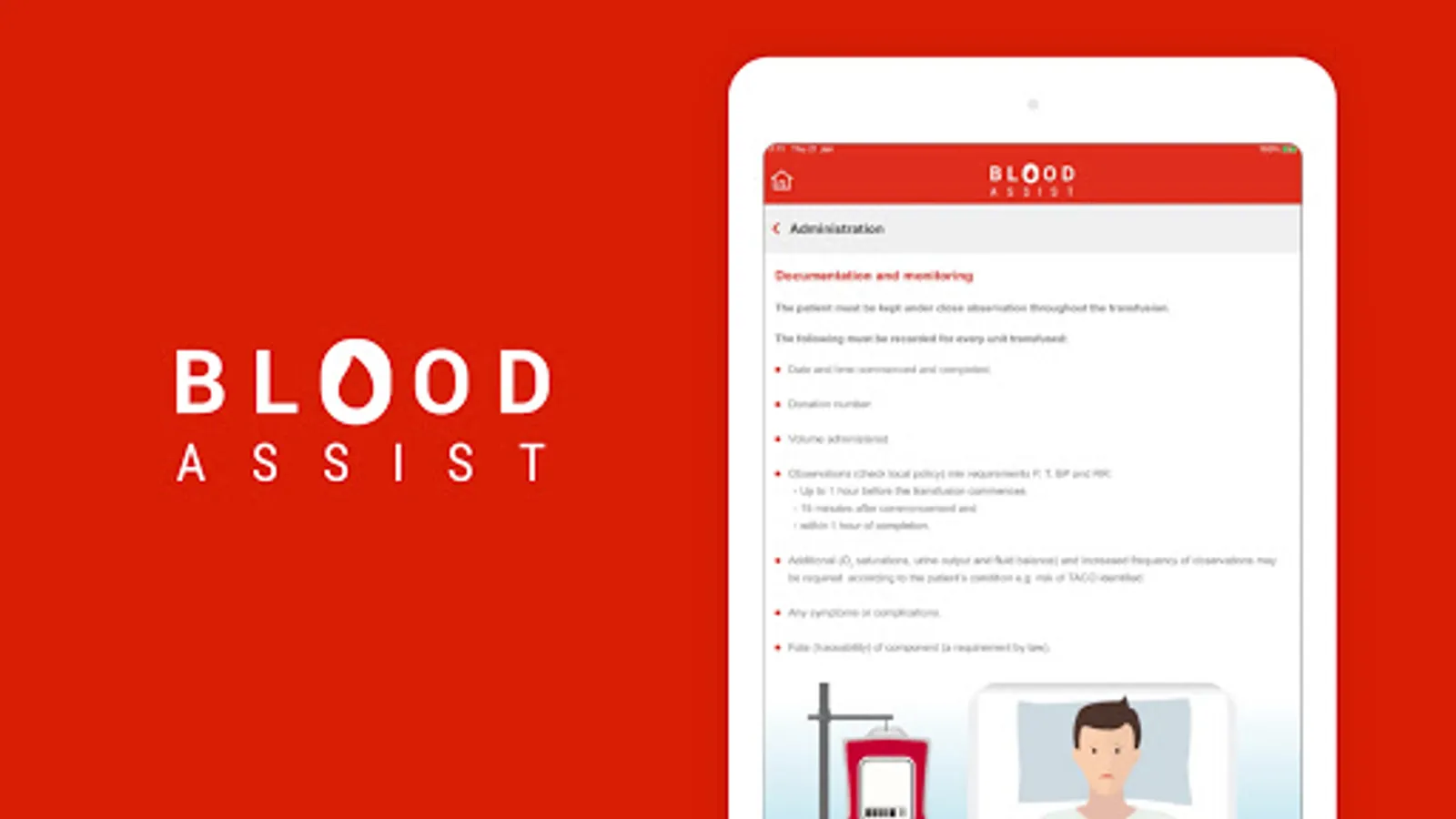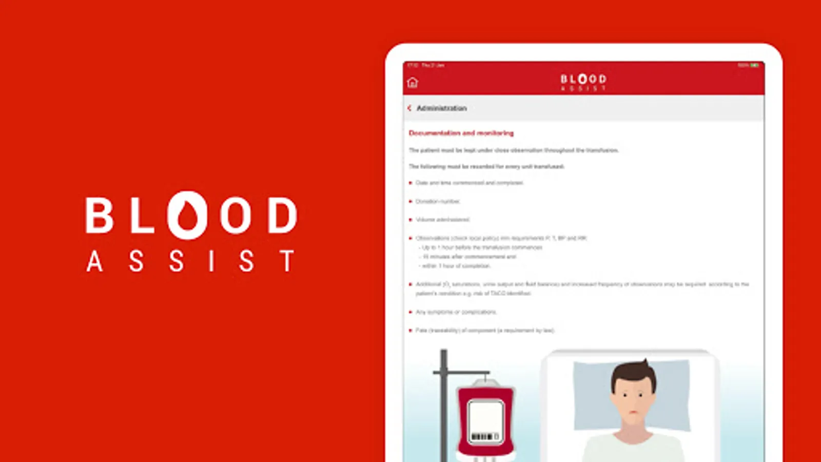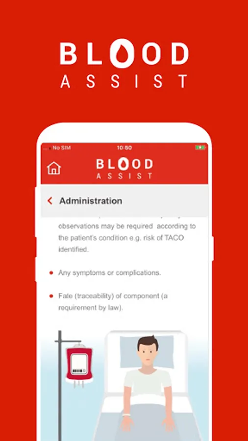 NHS Blood and Transplant developed Blood Assist to support healthcare professionals involved in the administration of blood components and the care of patients during transfusion. It provides an aide memoir for best practice in administration summarising key guidelines and recommendations from SHOT, the British Society for Haematology and the Advisory Committee on the Safety of Blood Tissues and Organs. The app complies with NHSBT’s quality standards and has no associated information governance concerns as no patient data can be inputted.
