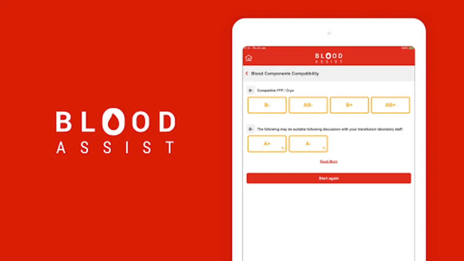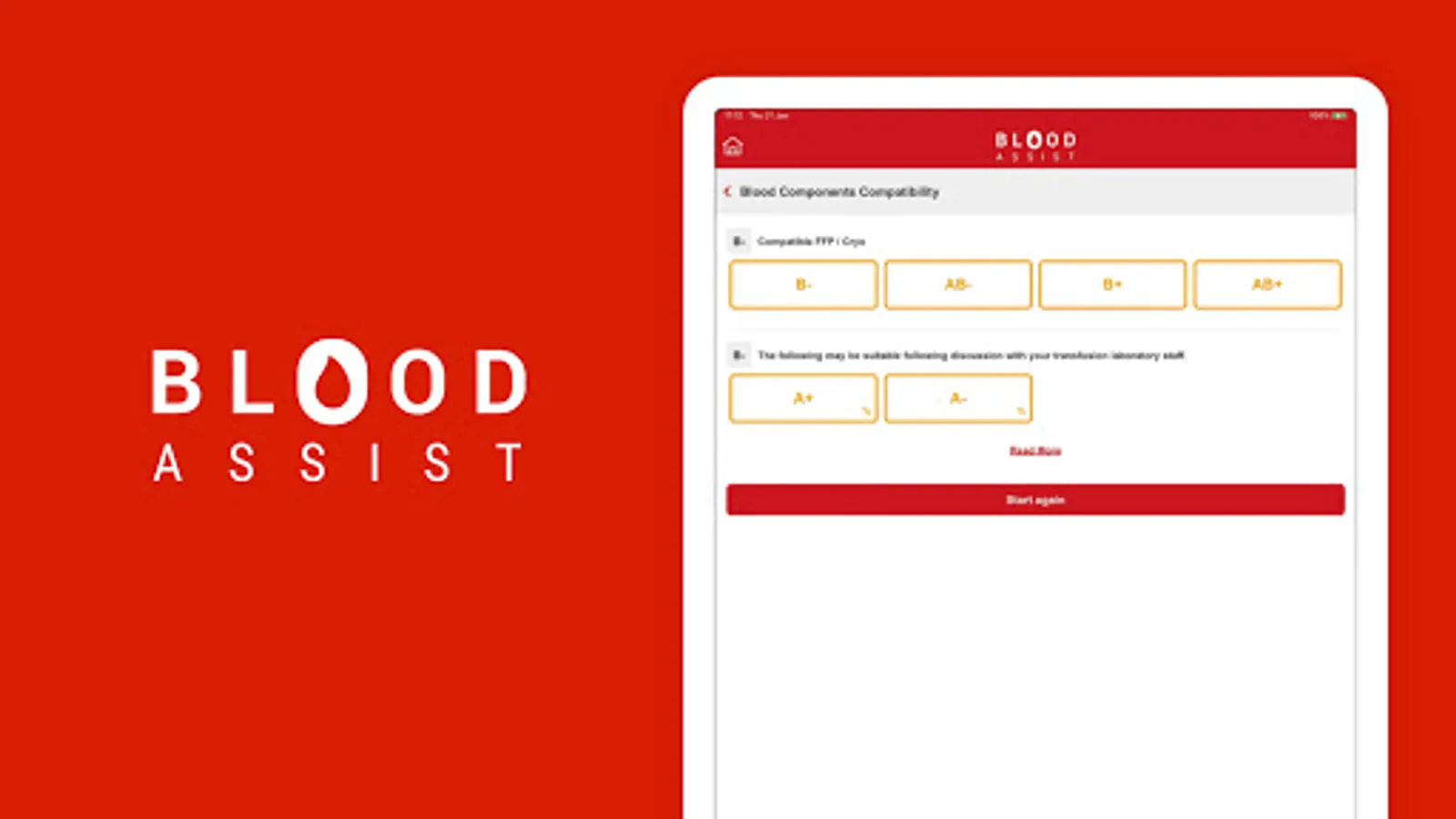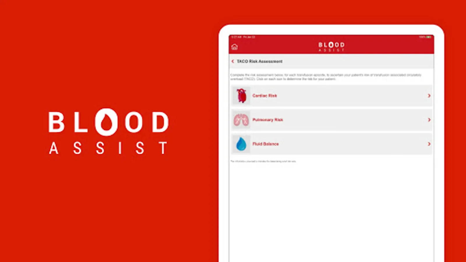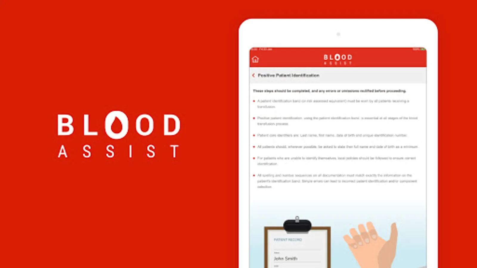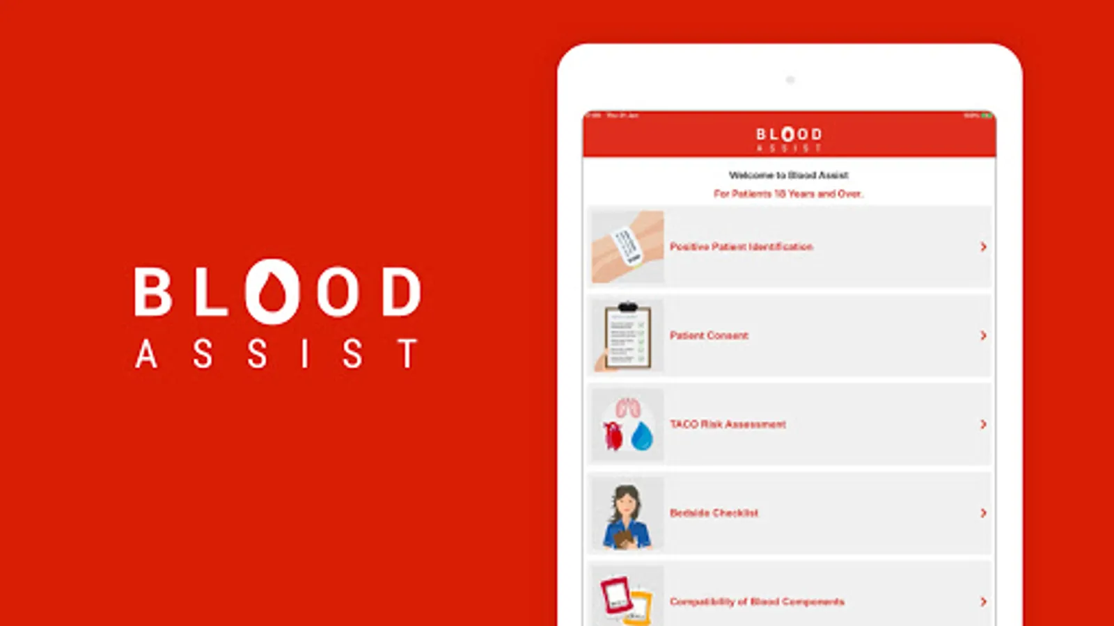 NHS Blood and Transplant developed Blood Assist to support healthcare professionals involved in the administration of blood components and the care of patients during transfusion. It provides an aide memoir for best practice in administration summarising key guidelines and recommendations from SHOT, the British Society for Haematology and the Advisory Committee on the Safety of Blood Tissues and Organs. The app complies with NHSBT’s quality standards and has no associated information governance concerns as no patient data can be inputted.