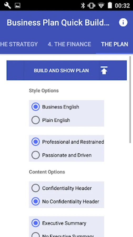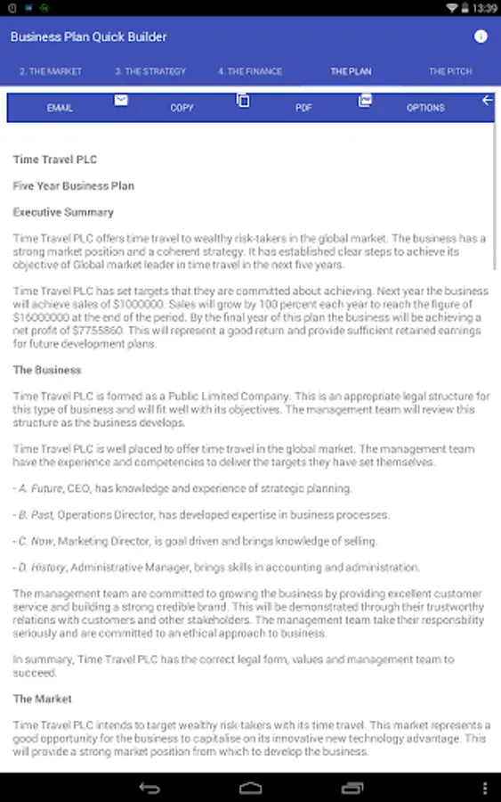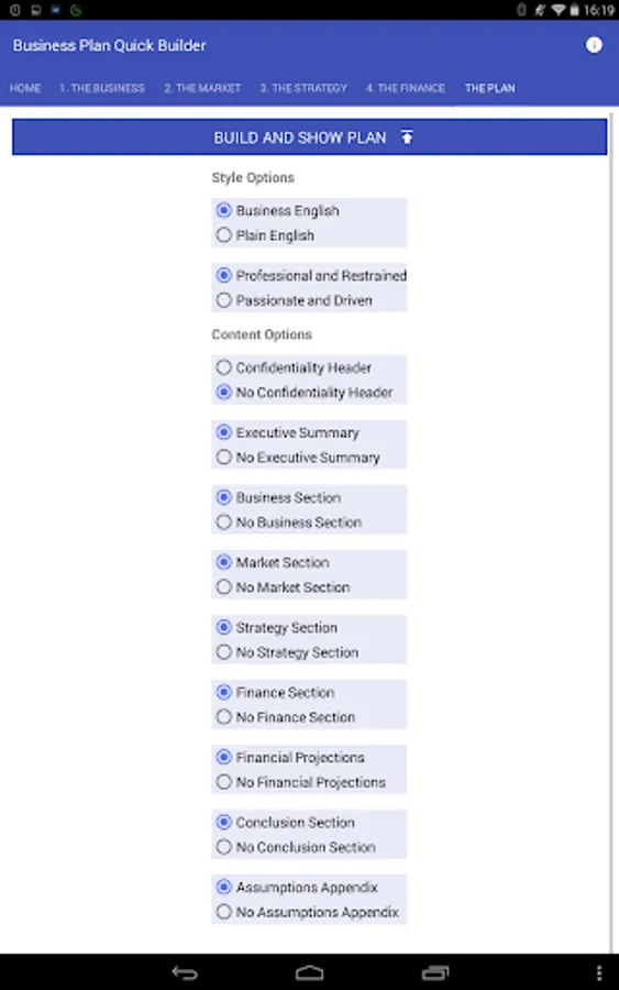 3. Press the button and the app will automatically write your customized business plan