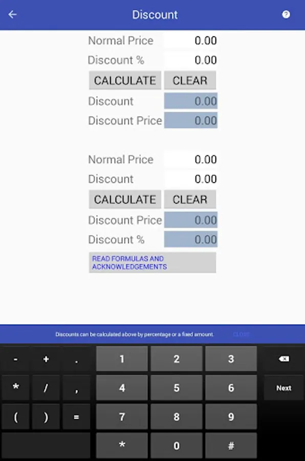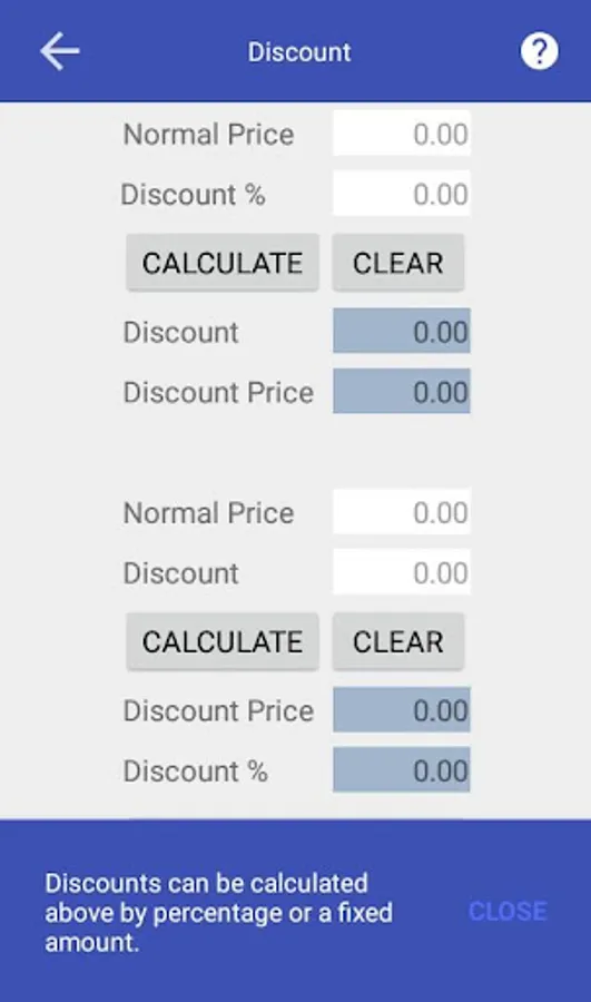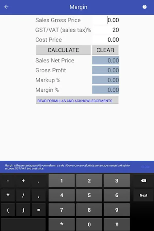 - Everyday business calculations: discount, markup, margin, profit, sales and tax