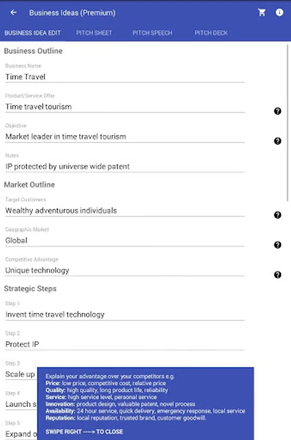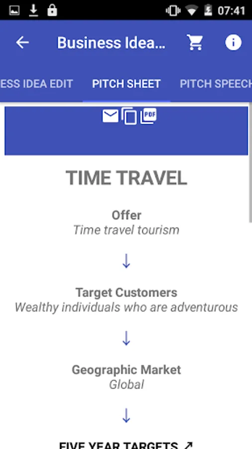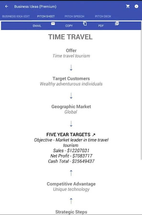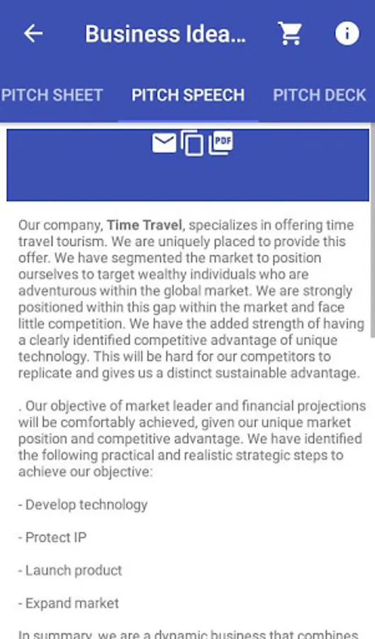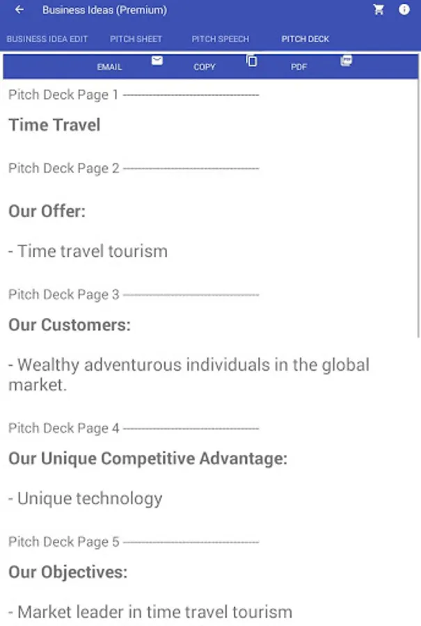- Share your business startup ideas and pitches by email, copy to clipboard, and by PDF