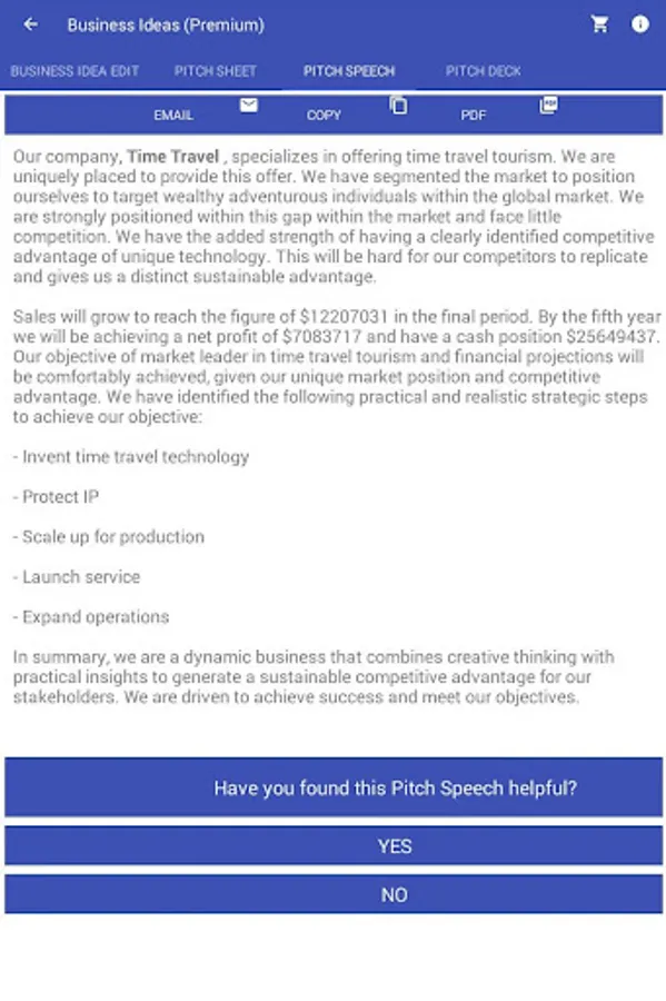 3. The app will automatically write your customized elevator pitch and five year financial forecast