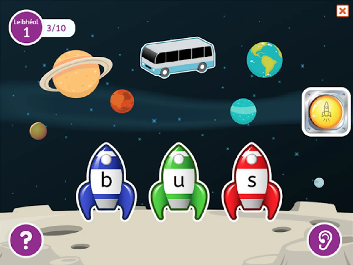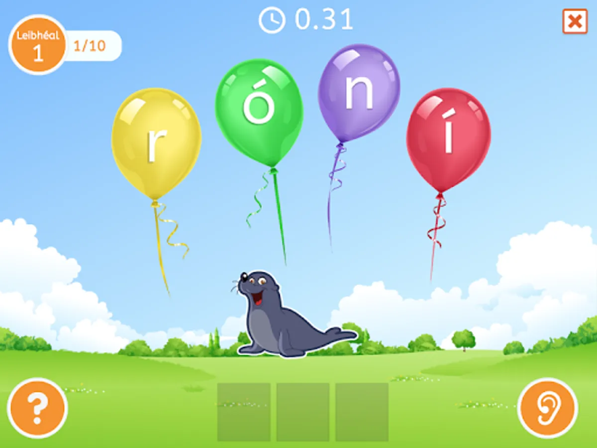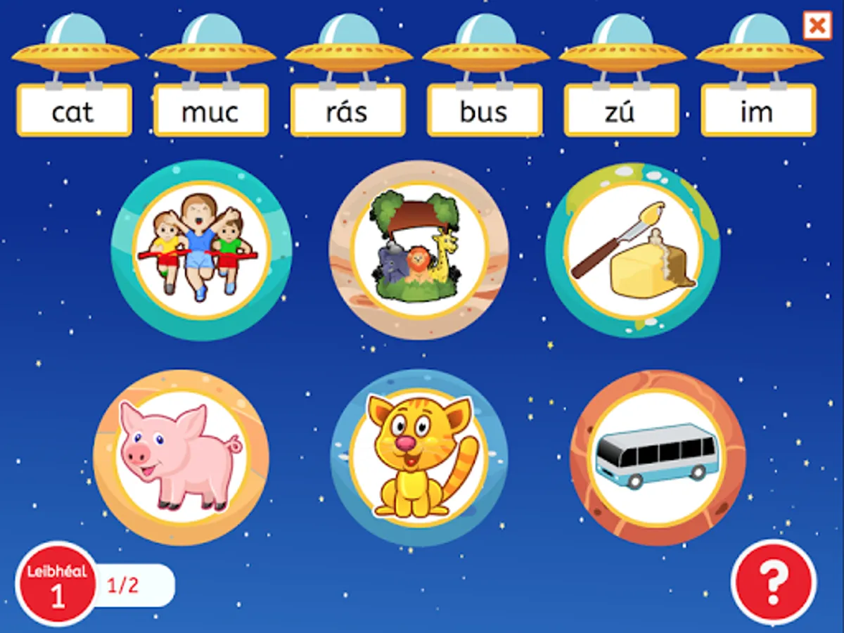 This App is based on the Cód na Gaeilge phonics programme produced by CCEA. The games complement the 6 stages in the programme and they are suitable for children in Primary 2-7. It is recommended the games are used in conjunction with the Cód na Gaeilge programme to consolidate learning. There are 6 games in total covering each stage in the programme, with some containing 3 levels of difficulty. The games comprise of spelling activities, matching activities and sorting activities. Pronunciation is modelled for the children who are certain to enjoy bursting balloons, hammering nails and scoring goals!