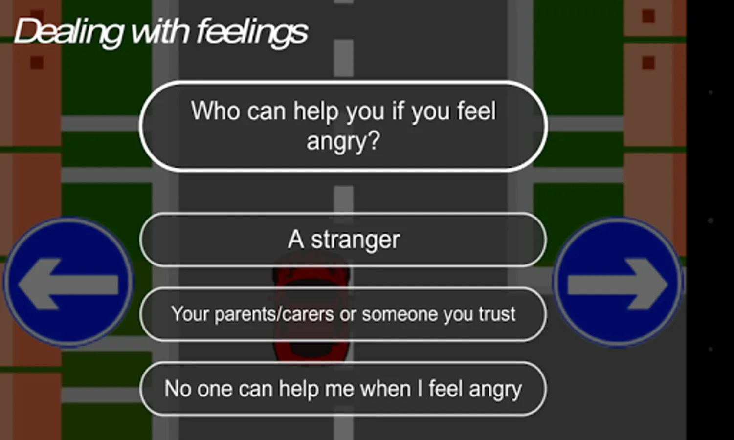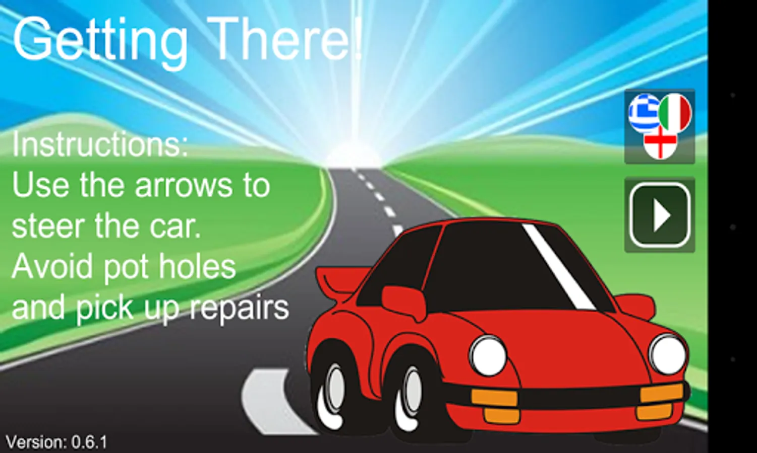 The player must steer the car avoiding the potholes, and collecting the repairs (tools icon). Each tool collected will trigger a multiple choice question. Answering the question correctly increases the score multiplier. Answering wrongly decreases the multiplier back to one. Crashing also results in a decrease in the multiplier. The aim is to reach the end with the highest score possible! The game is available in English, Italian and Greek.