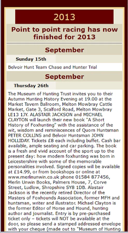 The Melton Hunt Club was formed in 1955 to raise money for the improvement of the Leicestershire side of the Belvoir hunting country. Founder Lance Newton had a vision that the Club should help and encourage the young (and not so young) from other hunting countries throughout the UK to come and experience the thrill of hunting in Leicestershire. It was decided to invite the Quorn and Cottesmore Hunts to join the MHC, and it was stipulated that any money raised would be divided between the three Hunts to be spent on country improvements within a ten-mile radius of Melton and not deposited in general Hunt funds.
