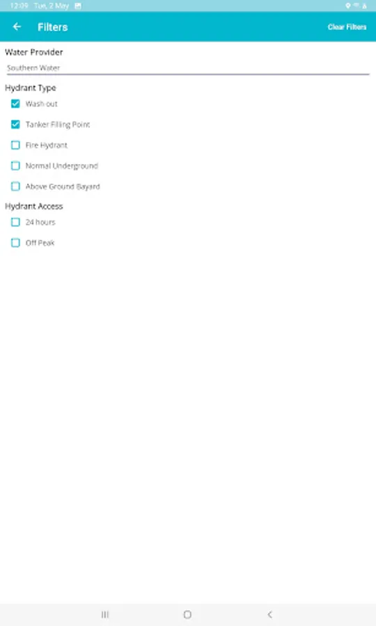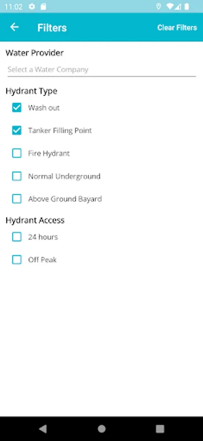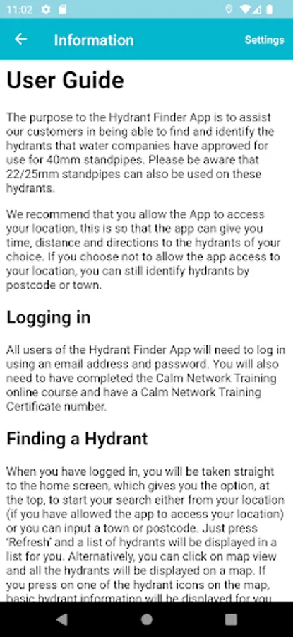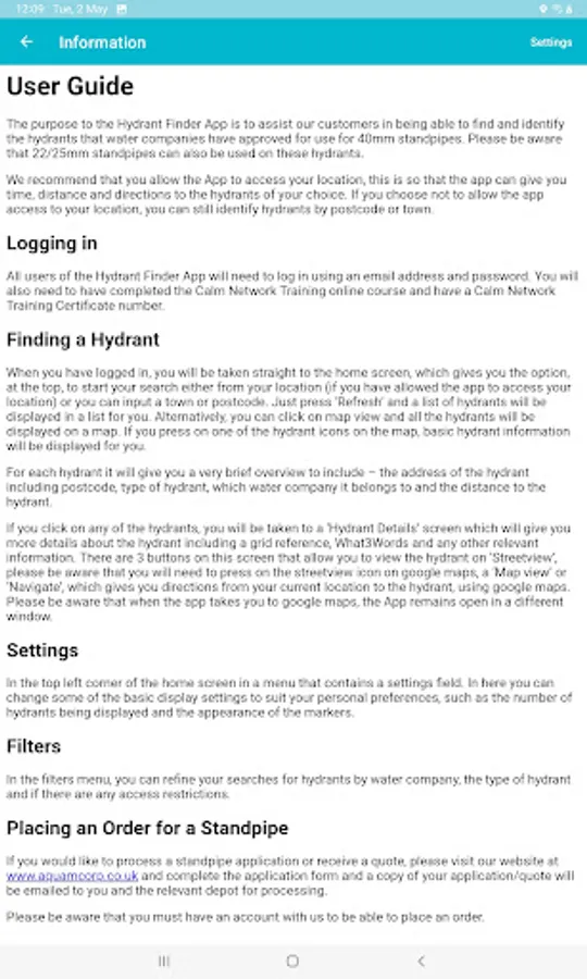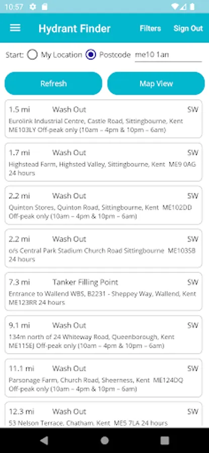 Users can search for hydrants by current device location (GPS) or Postcode/Place.