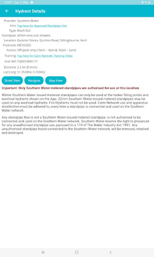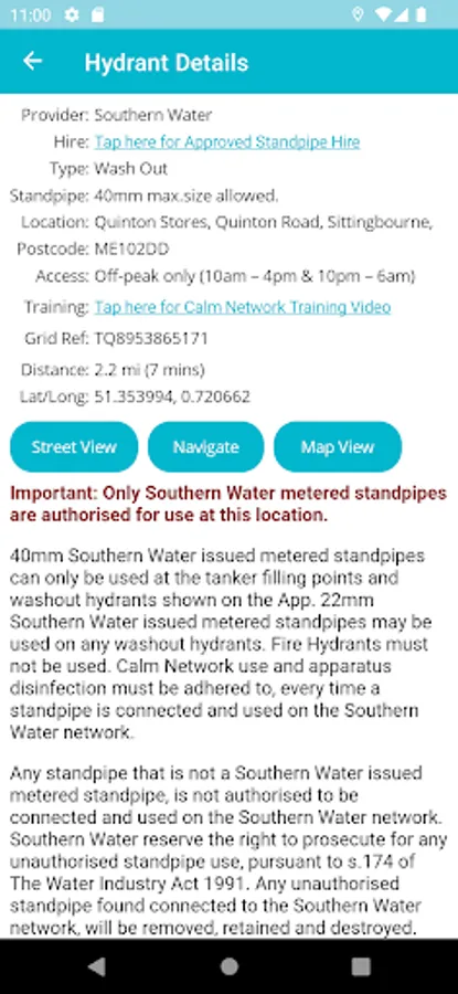Hydrant details include the Water Provider (e.g. Southern Water), type, address, postcode and access restrictions.