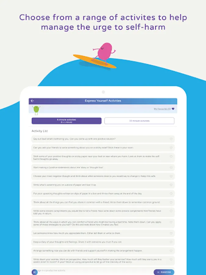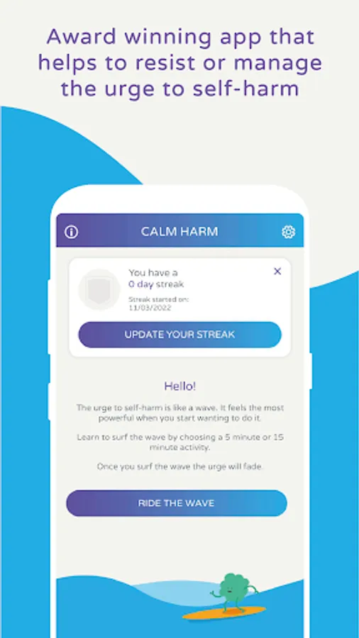 Join over 2 million users and learn to ride the wave with the free Calm Harm app by choosing activities from these categories: Comfort, Distract, Express Yourself, Release, and Random.