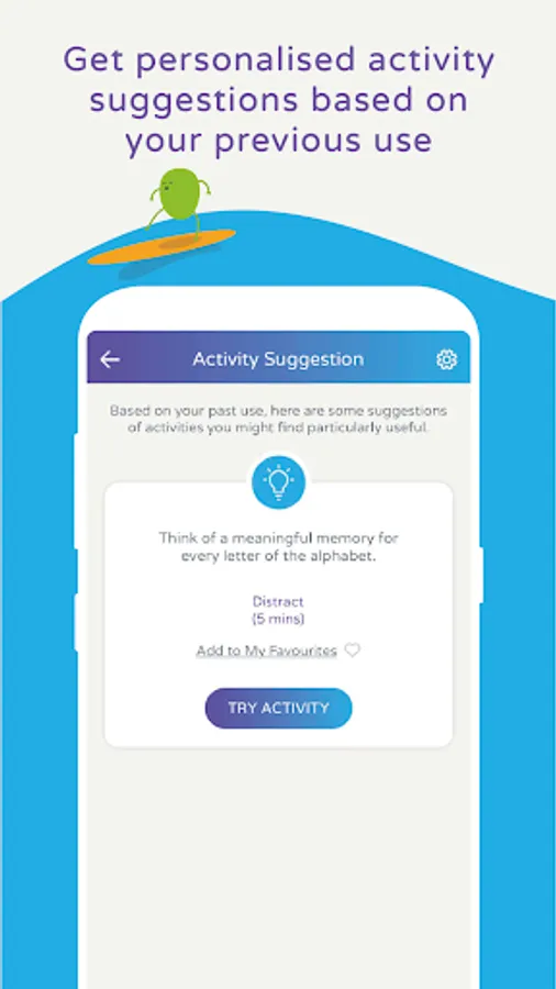 • Users choose 5-minute or 15-minute activities (from the same categories as before), counted down by a timer, that are based on the principles of a treatment technique called Dialectical Behaviour Therapy (DBT).