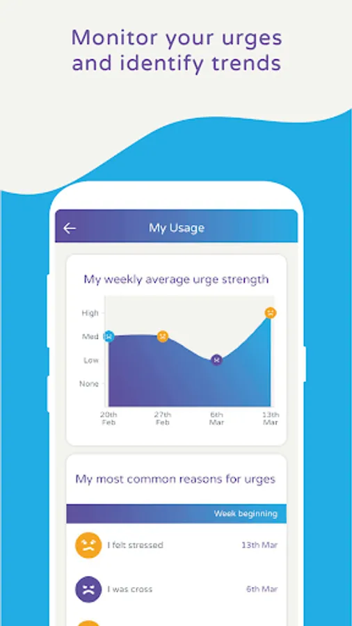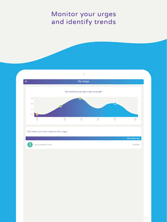 • Users can still record experiences in the log section (now called My Records) and see information such as weekly average urge strength, most common urges, and most active time of day.