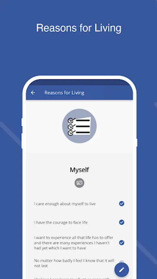• Reasons For Living - A place to keep statements reminding you why you should stay alive.