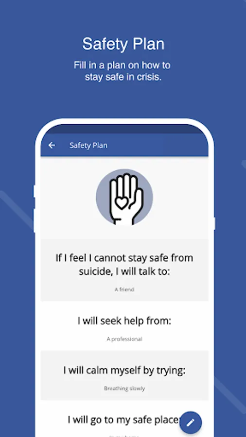 • Safety Plan - A customisable plan that can be filled out by a person considering suicide.