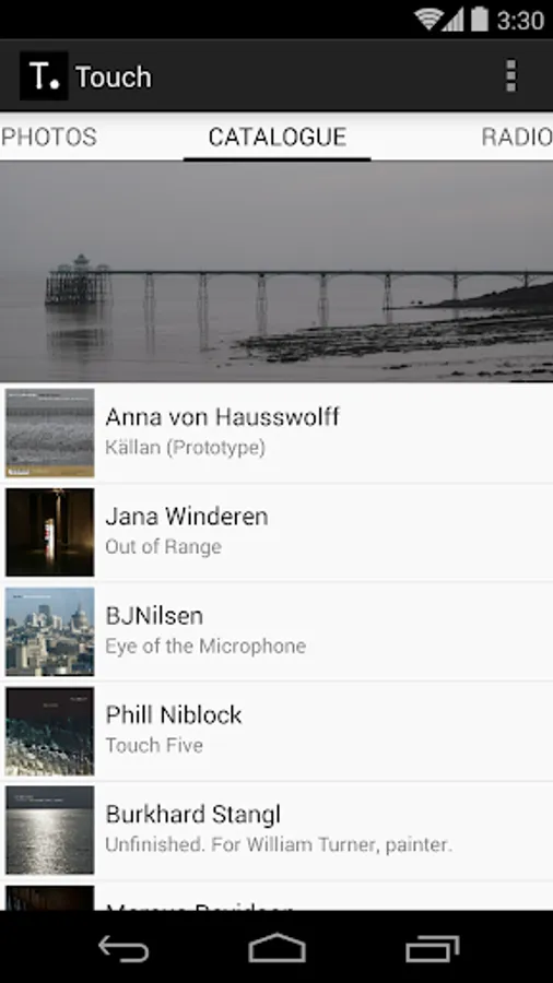 Artists released on Touch include Oren Ambarchi, Biosphere, Eleh, Fennesz, Soliman Gamil, Hildur Gudnadottir, Ryoji Ikeda, Philip Jeck, Phill Niblock, BJNilsen, Rosy Parlane, Sohrab, Mika Vainio, CM von Hausswolff, Chris Watson and Jana Winderen.
