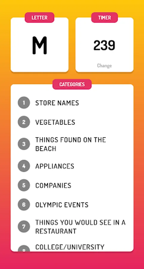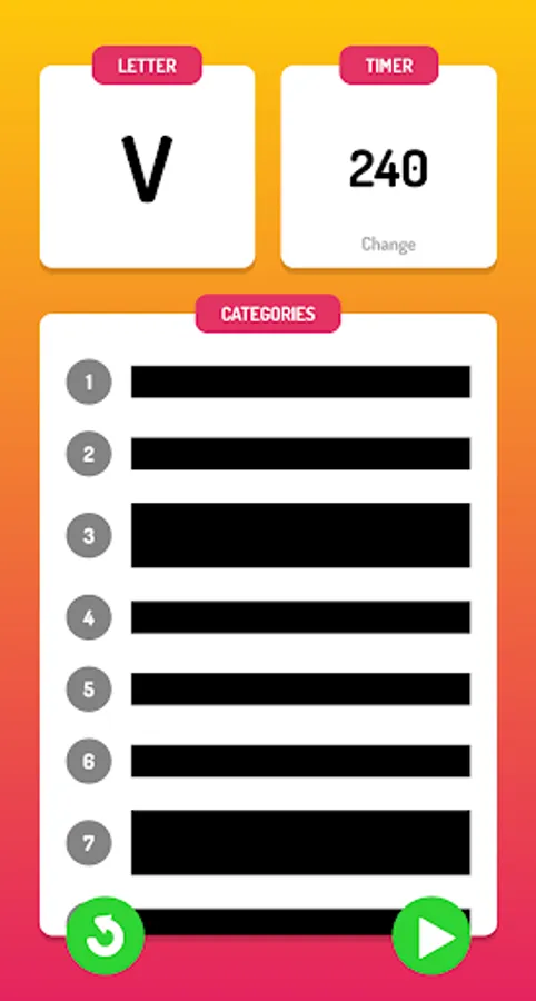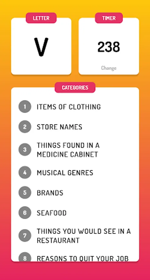 - The quiz master reads out the categories, and each player must write down a word beginning with the letter given for each category.