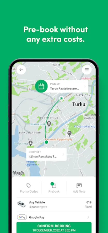 You can book a taxi straight away or prebook a ride for a later time and date. Booking is always free of charge and you will see a fixed price before the ride. You can pay for your ride using a card, using Apple Pay or after your ride in the car.