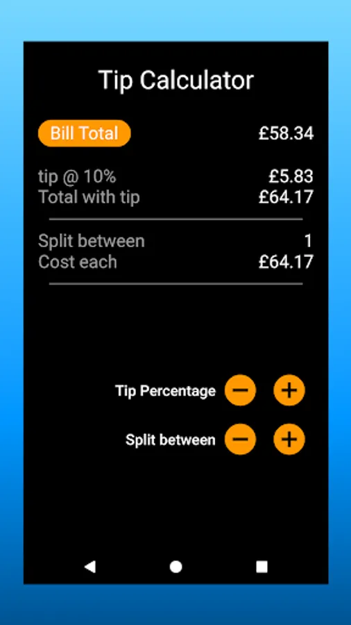 You can enter the bill amount, the tip you want to add and how many people you want to split the bill between. The app will then show you the cost per person.