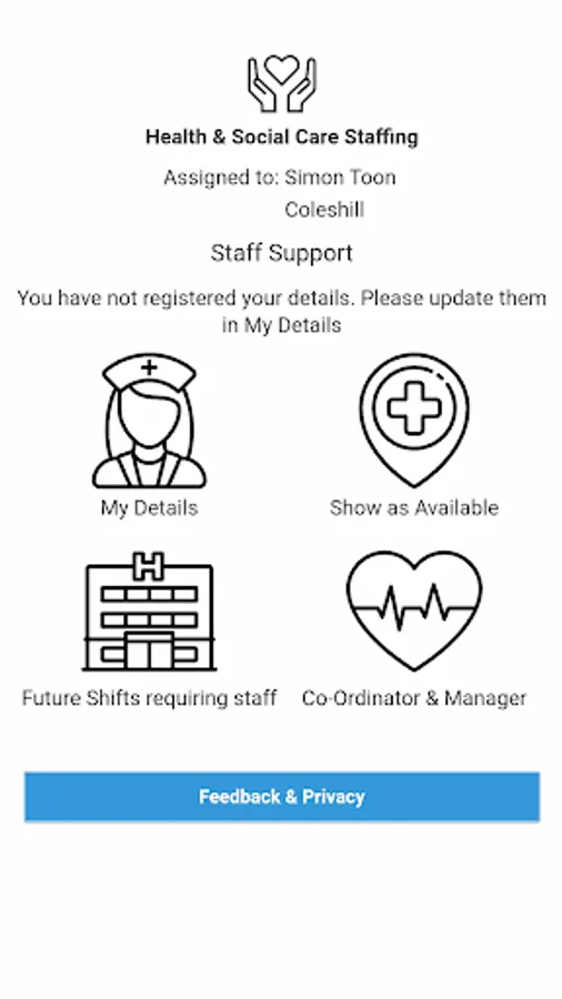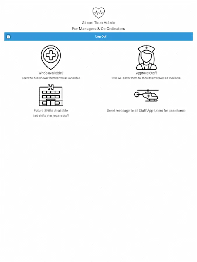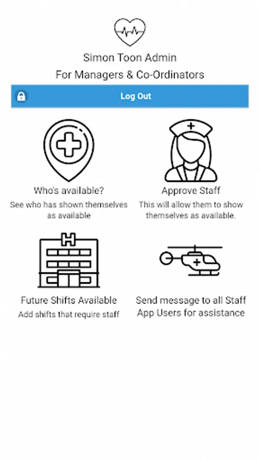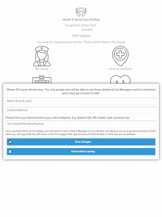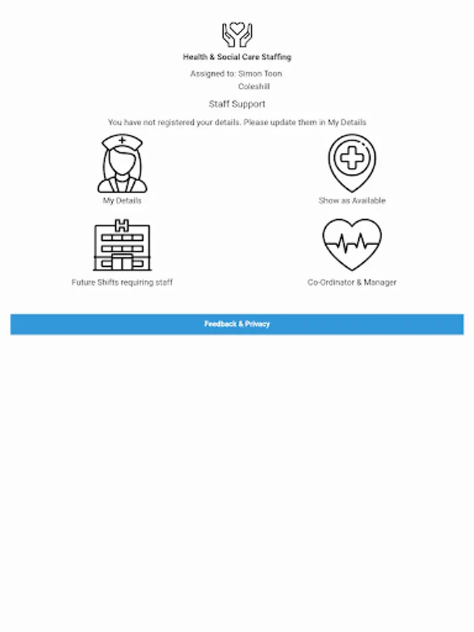 Health & Social Care providers can allow their staff to register on the app and show when they are available at short notice. The Manager/Co-ordinator of the the unit can then, in time of need, see who is available to assist.