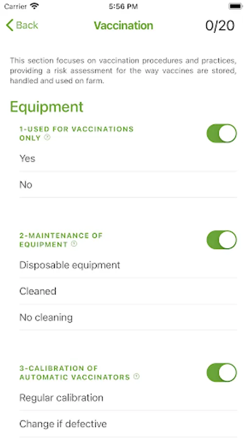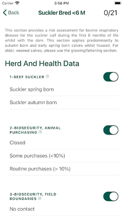 Rispaudit® is a mobile application created for veterinary surgeons to facilitate on farm risk assessments for calf respiratory disease. The UK Rispaudit® App consists of 6 risk assessments sections, 3 of which are based on production type. Each section consists of a series of questions with multiple choice answers. The answers are used to automatically generate a PDF farm report highlighting the moderate and high-risk factors which have been identified. The Report can be personalised, adding vet and farm details, photographs and a priority list with agreed actions and timelines. Reports can be saved and/or shared with the farmer instantly through the mobile application, thus enabling the veterinary surgeon to quickly and easily provide an assessment report for the farmer.