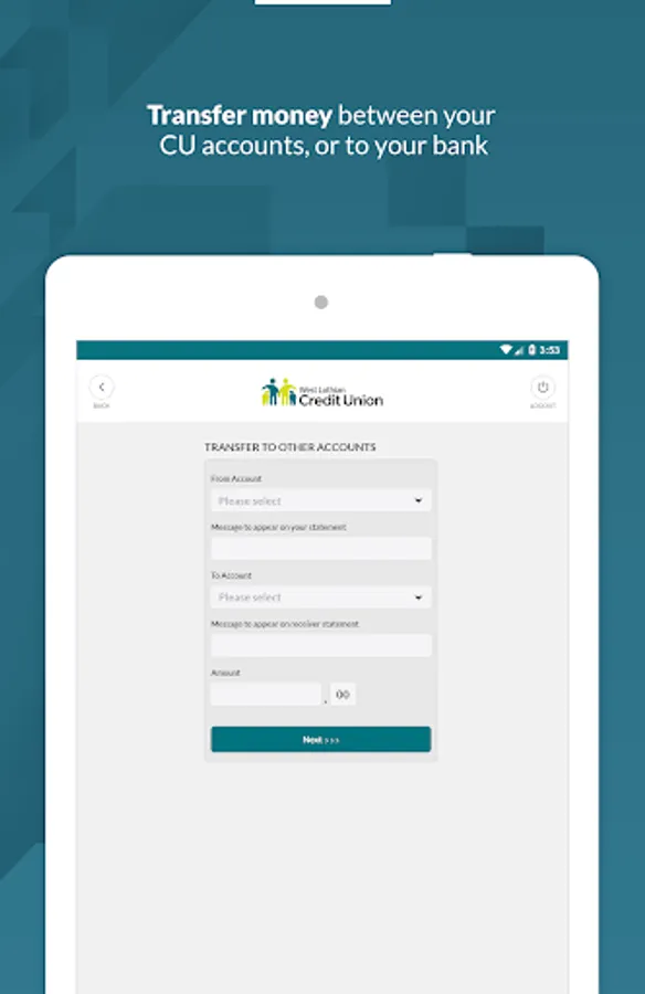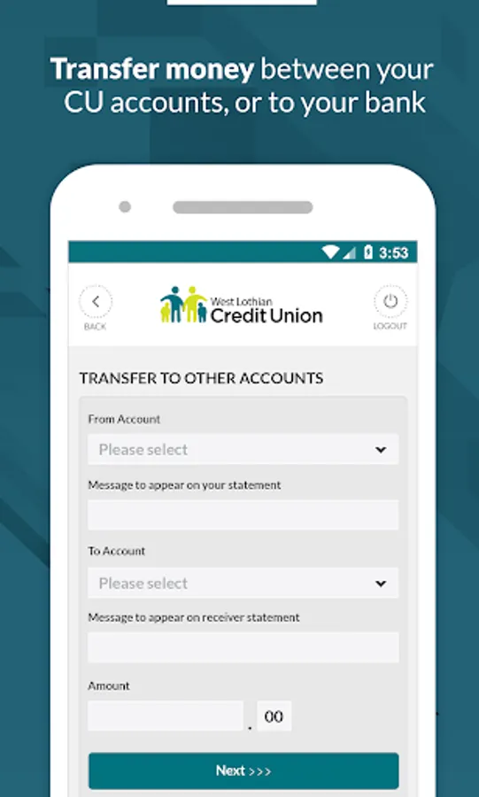 You will be asked to review, and accept, our Terms and Conditions. These can also be viewed at www.westlothiancreditunion.co.uk. Please note, all external accounts and utility bills must have already been registered through your Online Banking account, prior to using the App.