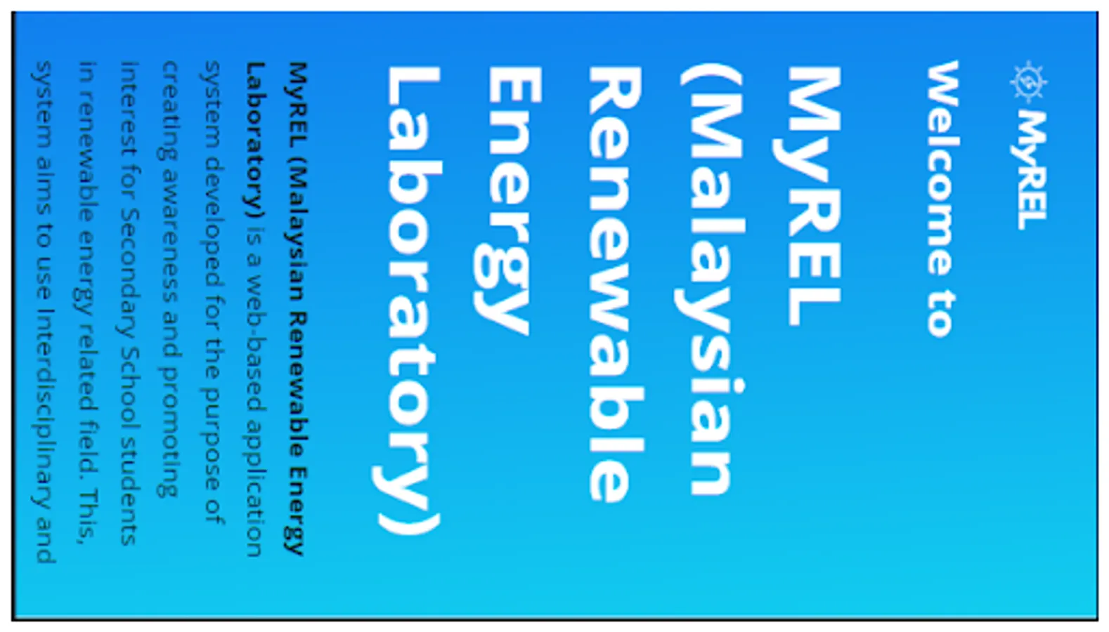 MyREL is a simple educational application that allows users to interact with the system and access contents like slides, articles, videos and quizzes to learn about environmental issues, Renewable Energy and it's components.