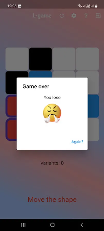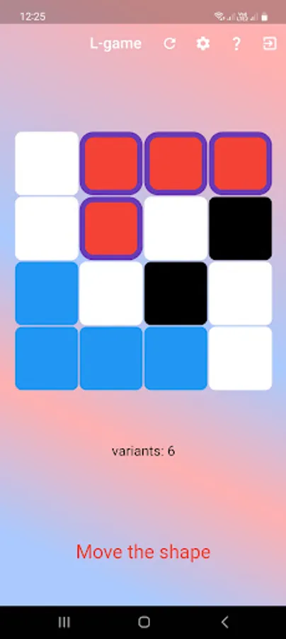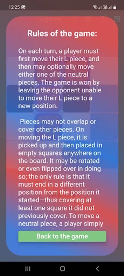 Pieces may not overlap or cover other pieces. On moving the L piece, it is picked up and then placed in empty squares anywhere on the board. It may be rotated or even flipped over in doing so; the only rule is that it must end in a different position from the position it started—thus covering at least one square it did not previously cover. To move a neutral piece, a player simply picks it up then places it in an empty square anywhere on the board.