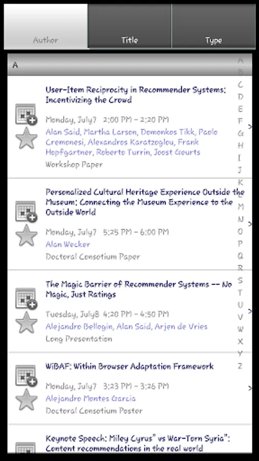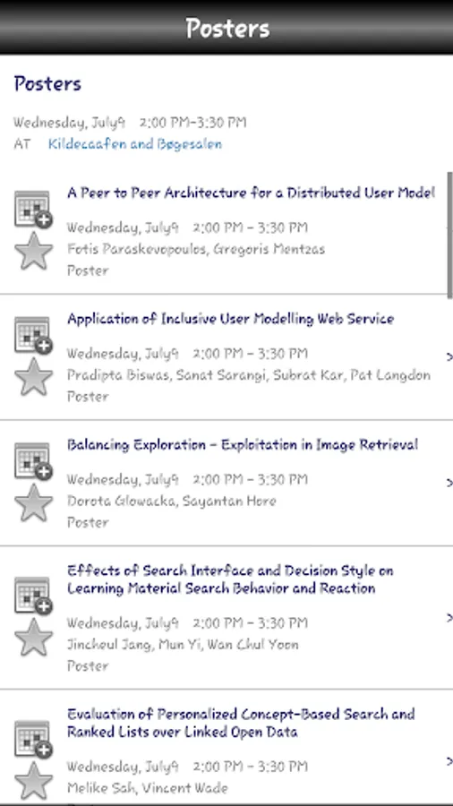 The mobile version of Conference Navigator for UMAP 2014, 22nd International Conference on User Modeling, Adaptation and Personalization (http://www.umap2014.org/). The app allows viewing conference schedule, presented papers, workshops, tutorials, keynotes, and posters. You can mark and schedule papers you liked and interested to attend. The schedule is being synchronized with the Web version of the UMAP 2014 Conference Navigator (http://halley.exp.sis.pitt.edu/cn3/conferenceHomePage.php?conferenceID=129).