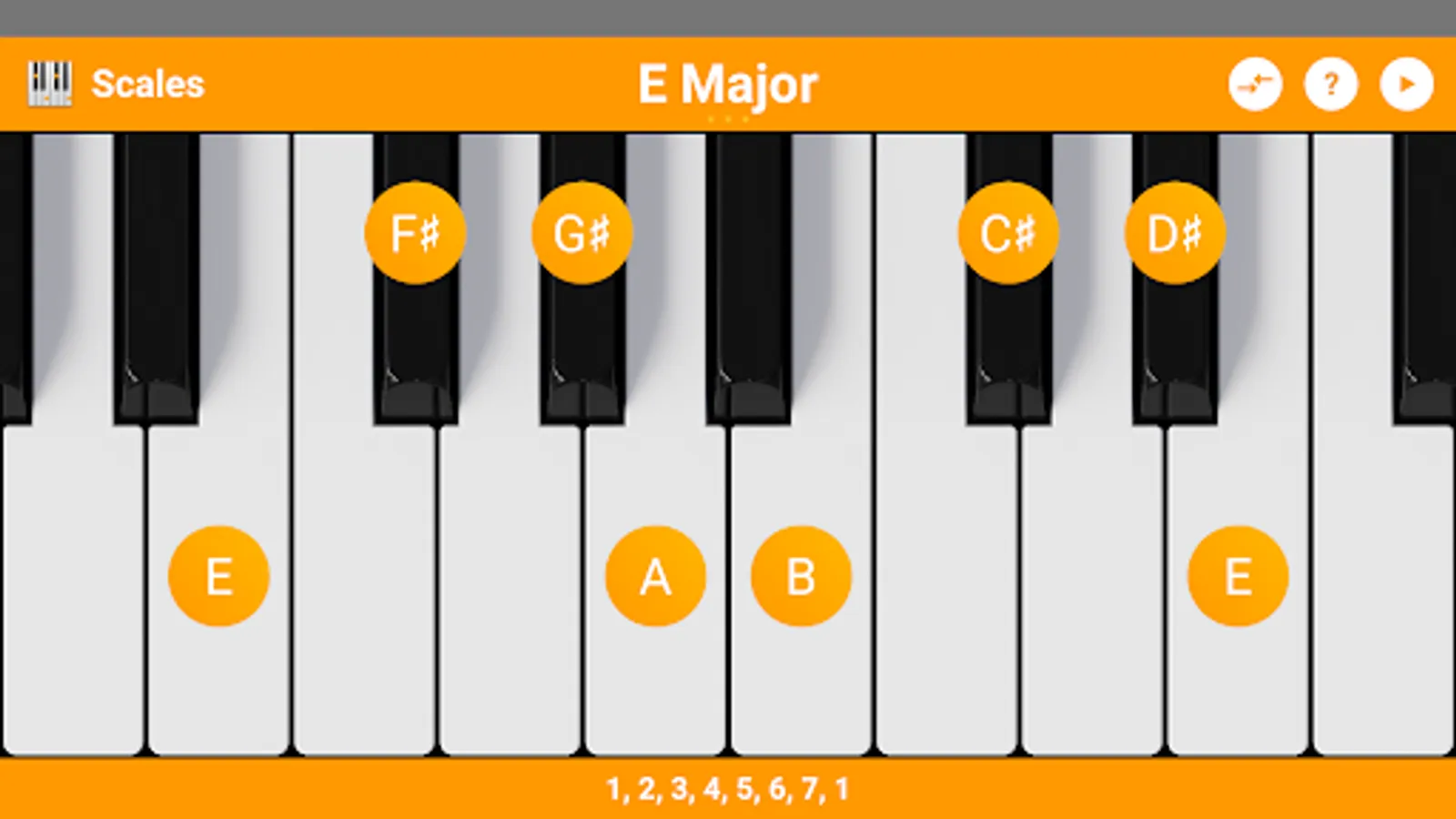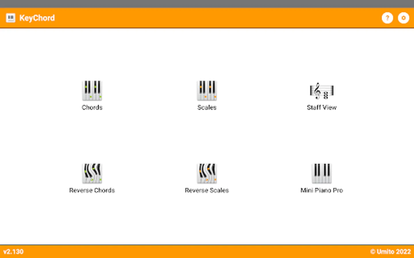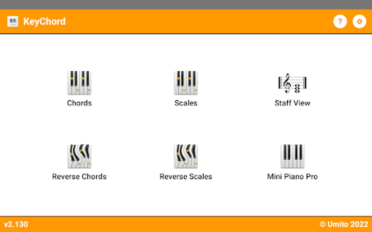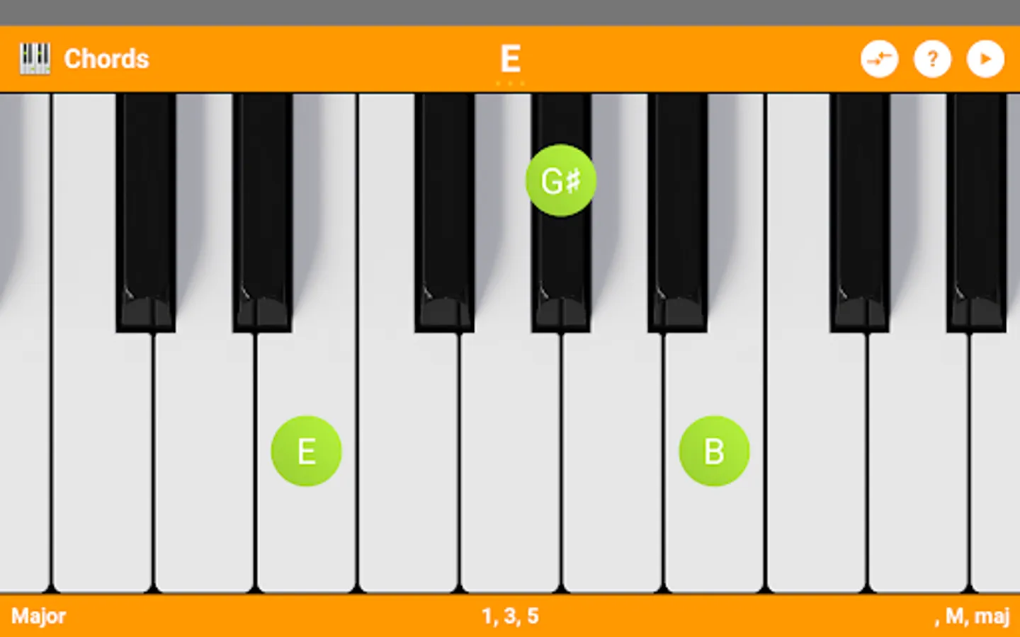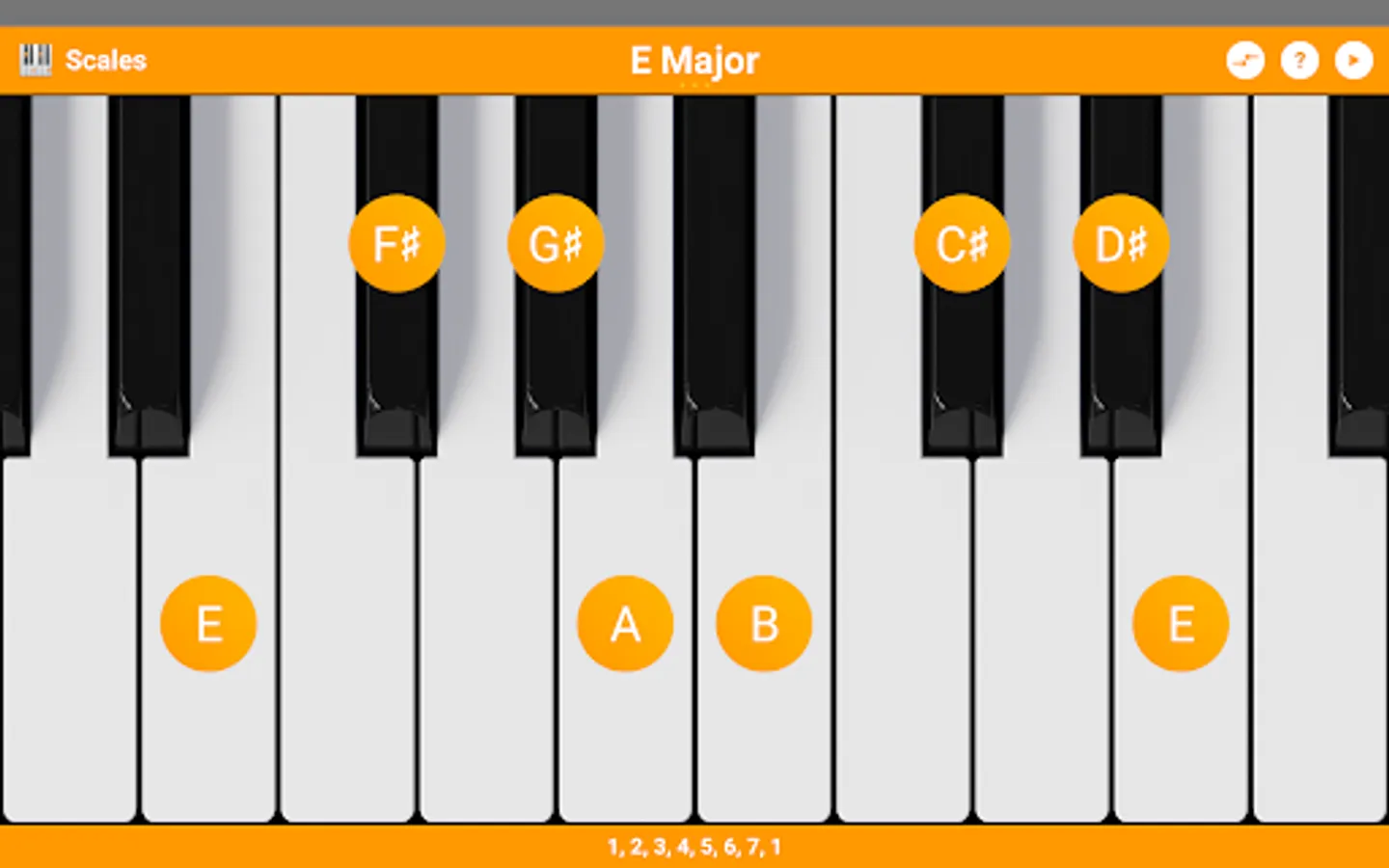 KeyChord is built around a virtual keyboard that you can use to interact with the selected chord- or scaletype. You can for instance tap on a key to make it the root of the chord or you can longpress a selected chordnote to invert the chord to that position. Same goes for scales. Tap a already selected rootnote for different kind of information modes like note-names or intervals.